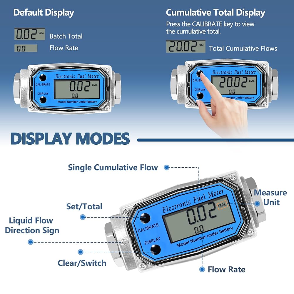 Digital LCD Display: The digital flow meter's clear LCD screen displays real-time flow rates, accumulated totals, and instantaneous flow, simplifying the monitoring and recording of your liquid usage. Single count range: 0.00-9999.9; Total cumulative count range: 0-99999