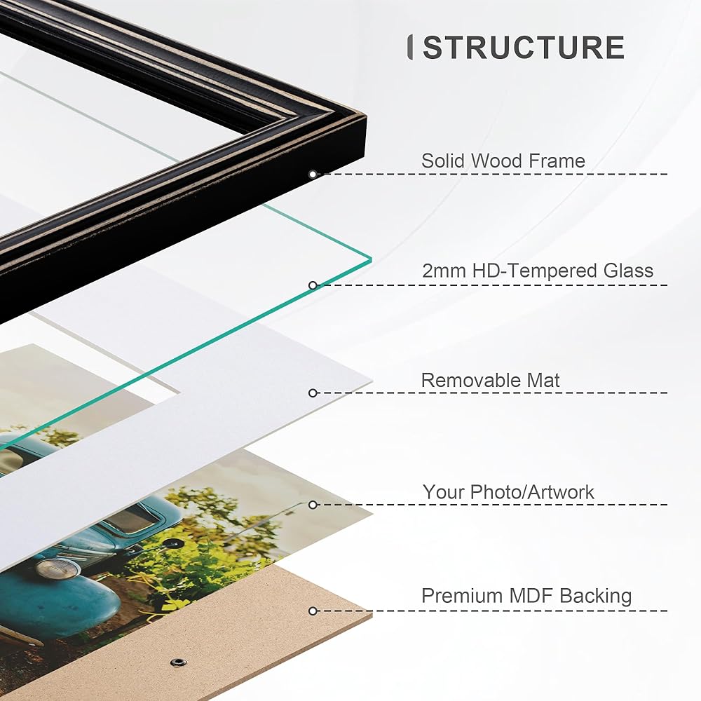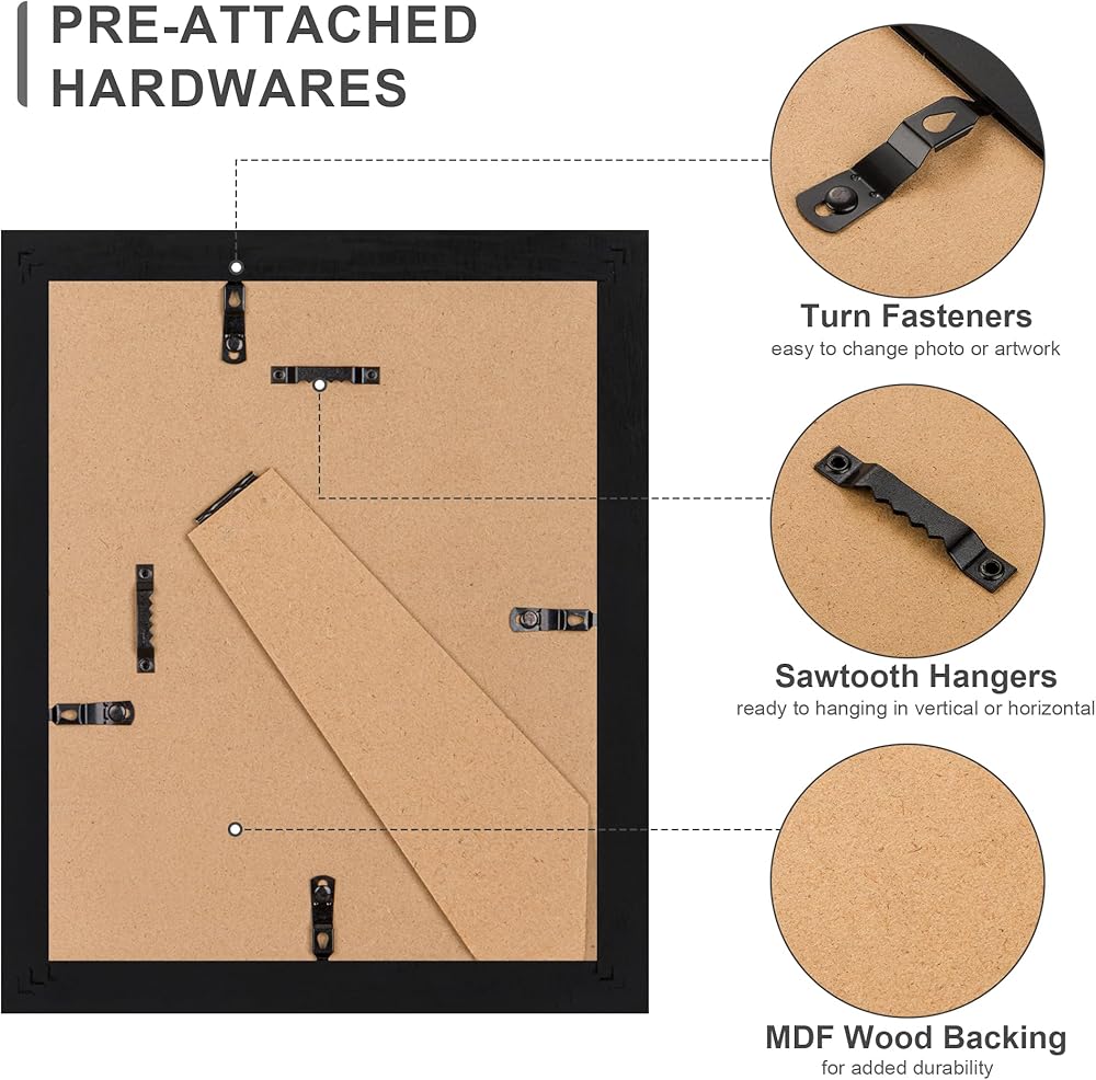 SAFE TEMPERED GLASS - These wood picture frames have sturdy 2.0mm tempered glass that protects your artwork from scratches and dust. Shattering into harmless granules if ever broken, you can rest assured of putting the 8x10 picture frame in any room