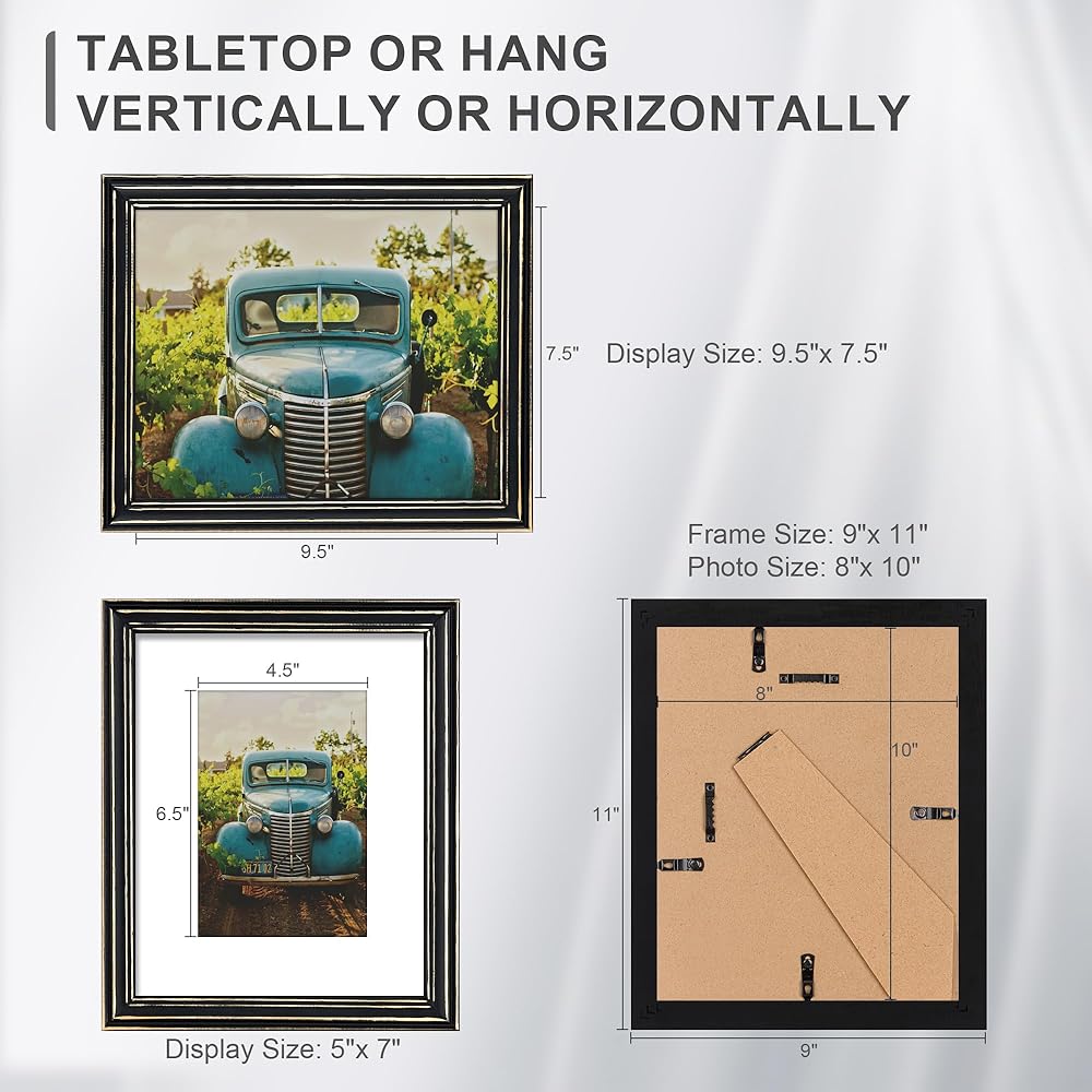 MULTIPLE DISPLAY OPTIONS - Our 8 x 10 photo frame displays 5x7 photos with the mat and 8x10 photos without the mat. They can be hung horizontally or vertically to fit your available space and stand independently on nightstands, coffee tables, and desks