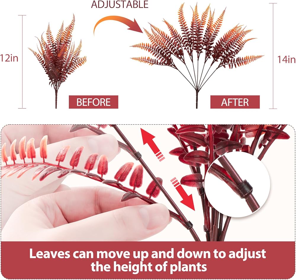 The artificial fall foliage set includes 16 bunches of Boston fern replicas, each measuring 12-14 inches in height. Each bundle features 7 stems, each with 3 leaves, providing ample material to fulfill your decorative needs.