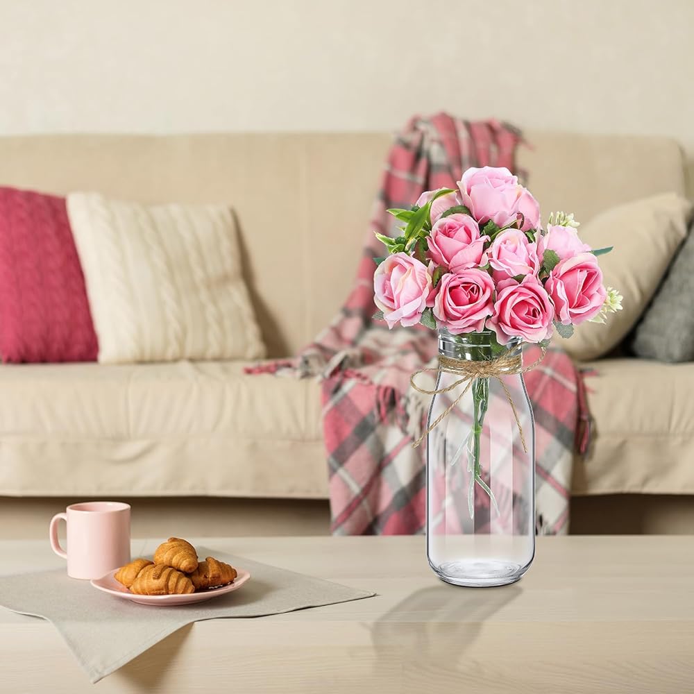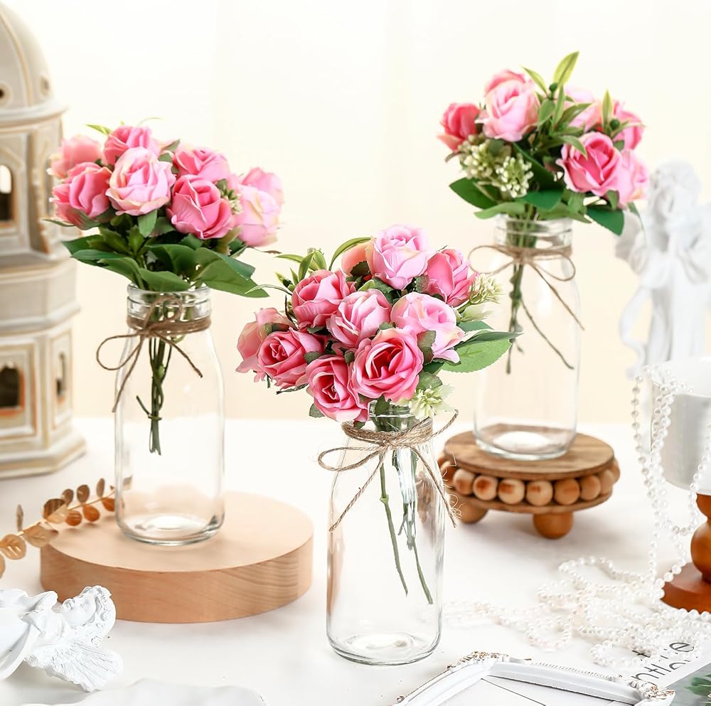 10 Sets Clear Glass Vase with Flowers Centerpieces Artificial Rose Flowers Arrangement with Glass Bottle Jars Home Decor for Wedding Table Centerpieces Room