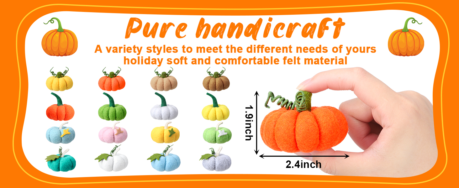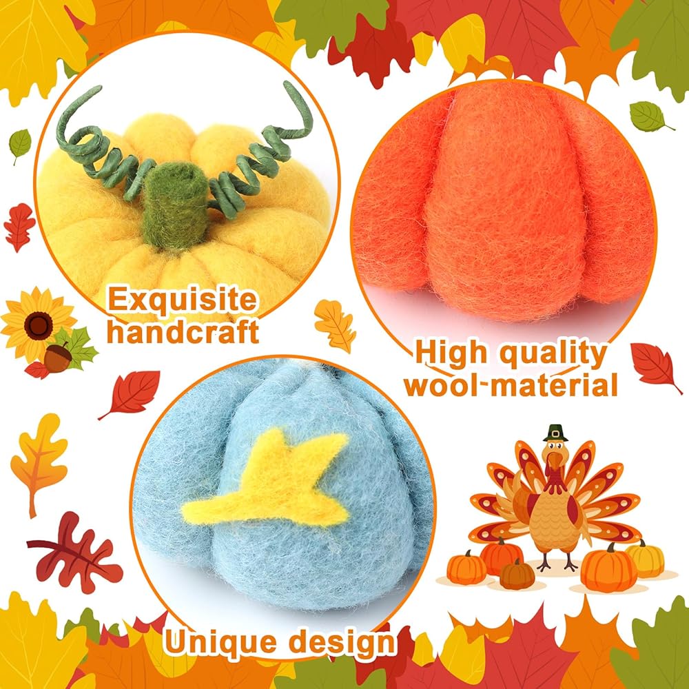 صناعة متقنة: زخارف اليقطين الصغيرة من اللباد المحاكاة مصنوعة من مادة اللباد، ناعمة ومريحة عند اللمس، ليس من السهل كسرها أو بهتانها أو تشوه، ويمكن استخدامها لفترة طويلة، ومناسبة لديكورات عيد الشكر في الخريف. مناسبة للحرف اليدوية مثل اللوحات الجدارية المصنوعة من اللباد الهالوين وقطع مركزية لطاولات العطلات وأشجار اليقطين وبيوت المزرعة والمزيد