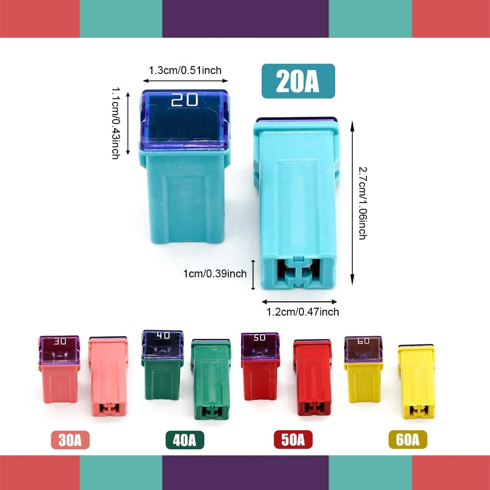 [Sufficient quantity] : You will receive 10 pieces of this mini car fuses, including five different colors, respectively: 2 blue 20A, 2 pink 30A, 2 green 40A, 2 red 50A and 2 yellow 60A, enough to meet your daily use and replacement needs. The car fuse is small in size, light in weight, easy to store and carry, you can put in the usual toolbox or backpack, convenient for you to use at any time, very convenient.