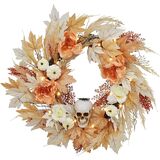 Halloween Skull Wreath: Our Halloween wreath is meticulously handcrafted on a vine base, adorned with grey white and yellow maple leaves, white pumpkins, blossoming flowers, and topped off with a skull centerpiece that adds an elegant yet eerie touch to your Halloween decor.