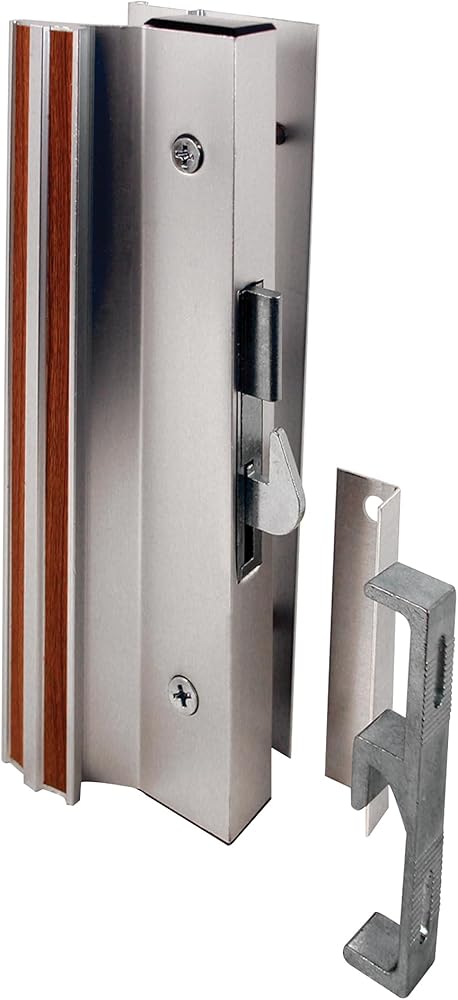 This white patio door handle is a surface with hook latch style. Often found on older style patio doors, it is mounted on the door's inside frame and the hook latch catches the keeper mounted on the jamb. It has a 1-1/8 inch high profile extruded aluminum with a white finished inside handle. Its features an anti-lift feature on the hook latch. The mounting holes are 4-15/16 inch on center. Outside handle is a low profile extruded pull.
