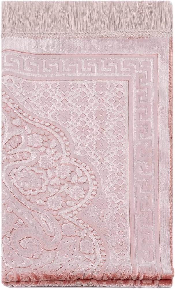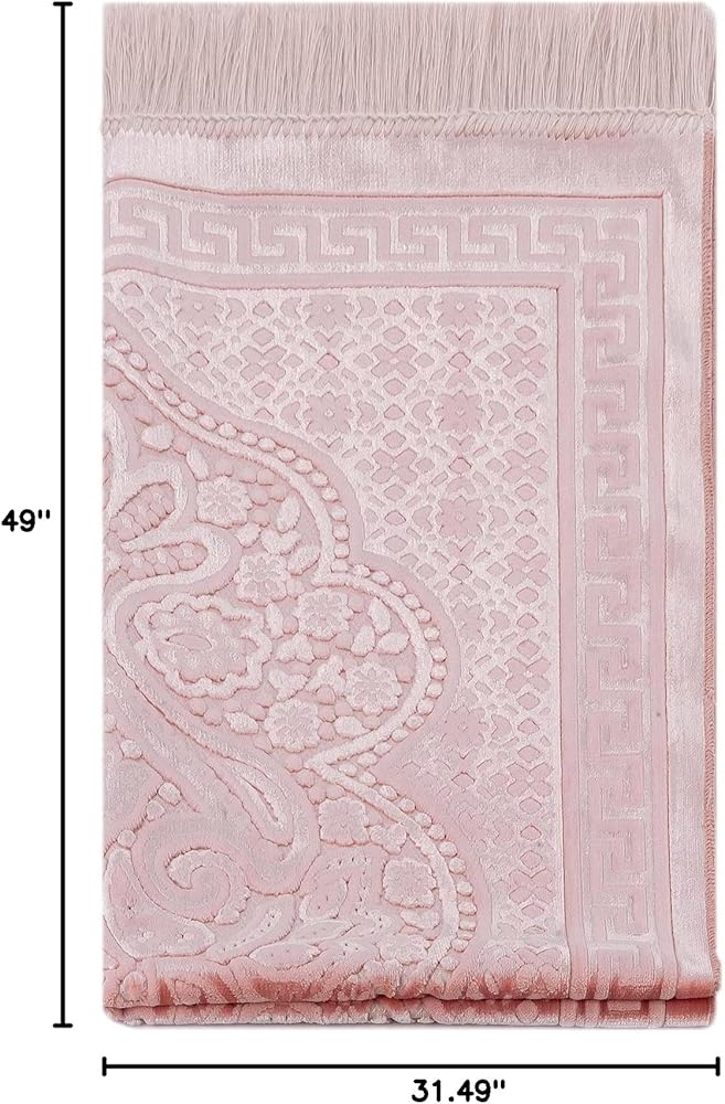 MATERIAL & SIZE - The prayer rug, It is a velvet made of cotton and polyester, making this a soft Islamic prayer rug that welcomes your spiritual energy while being durable and made to last. The luxurious sheen makes it shimmer in the light, and look different shades depending on the angle. Sajjadah size is (excluding tassels) 45.2" x 27.5" (115cm x 70cm) Weight: 695 grams. Prayer carpet Made in Turkey.