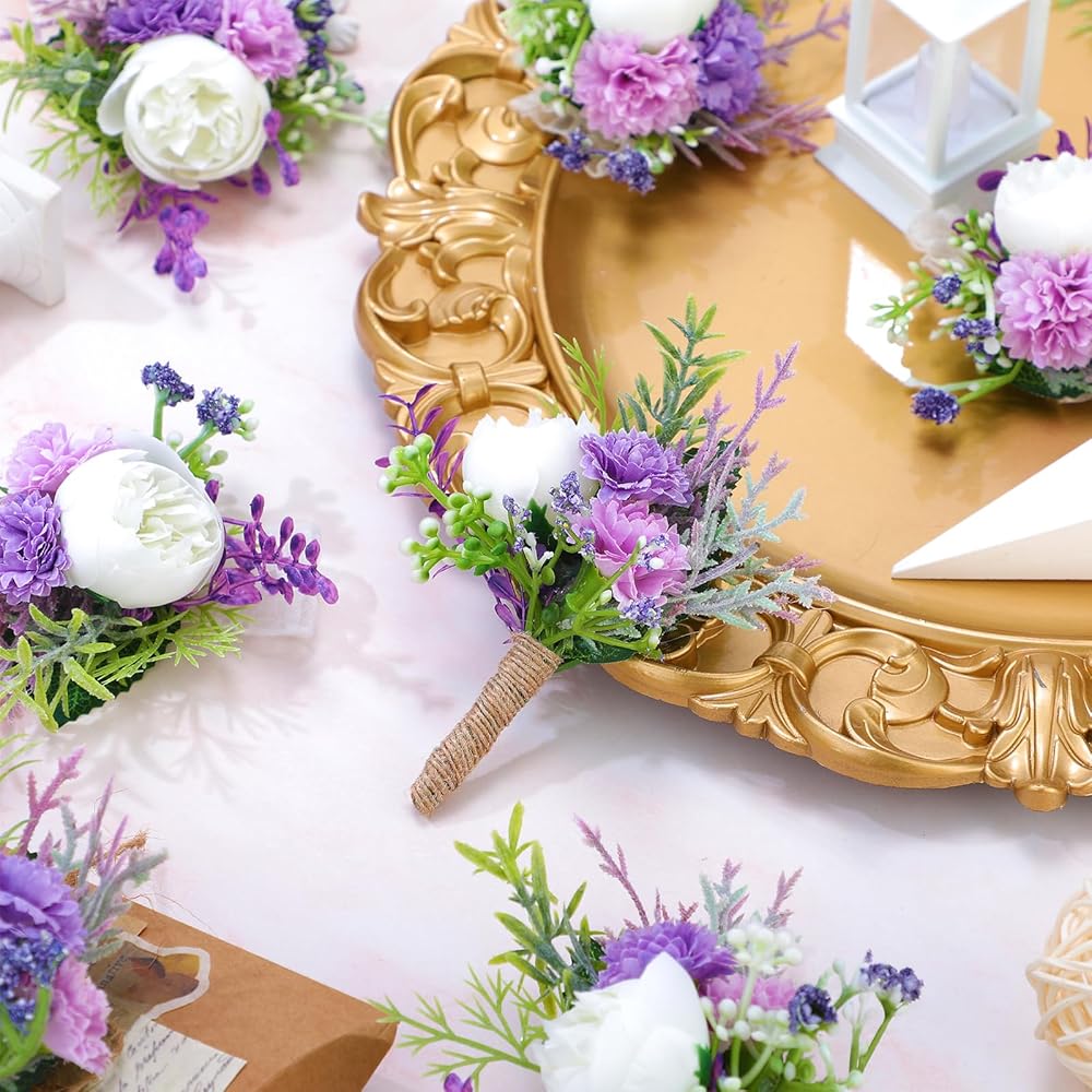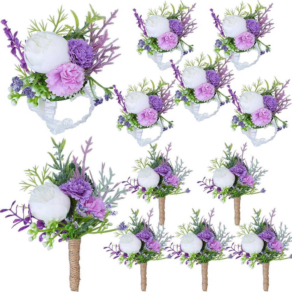 12 Pcs Wedding Corsage and Boutonniere Set Artificial Rose Wedding Corsage Wristband with Pins for Prom Men Bride Party Accessories Groom Groomsmen Bridesmaids Women (Bright,Purple)