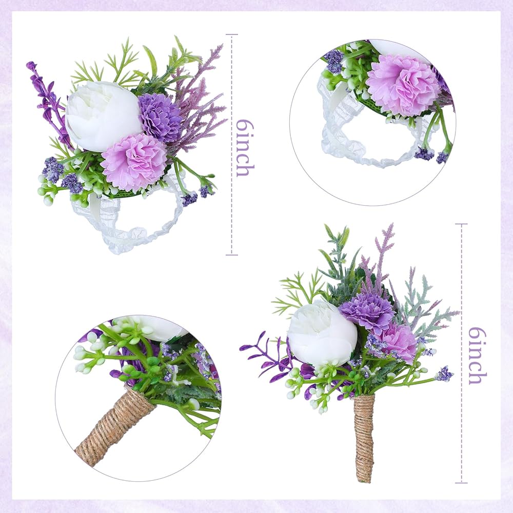 Elegant Wedding Decoration: this prom flower wrist corsage set applies delicate and elegant white rose as the main element, with some purple cypress leaves, purple lilac, and some other elements, adding some cute and elegance to your special day