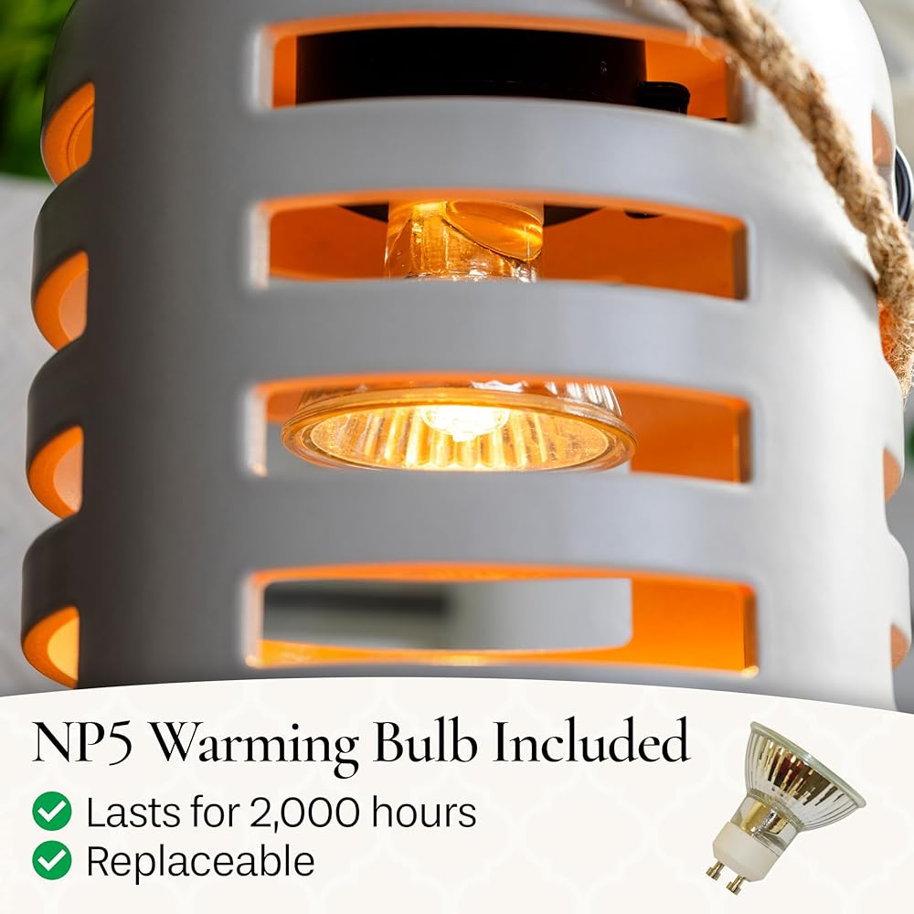 INCLUDES: Warmer and NP5 Warming bulb. The cord is 3 ft long with a dial switch for easy on/off. 1 Year limited warranty against factory defects.