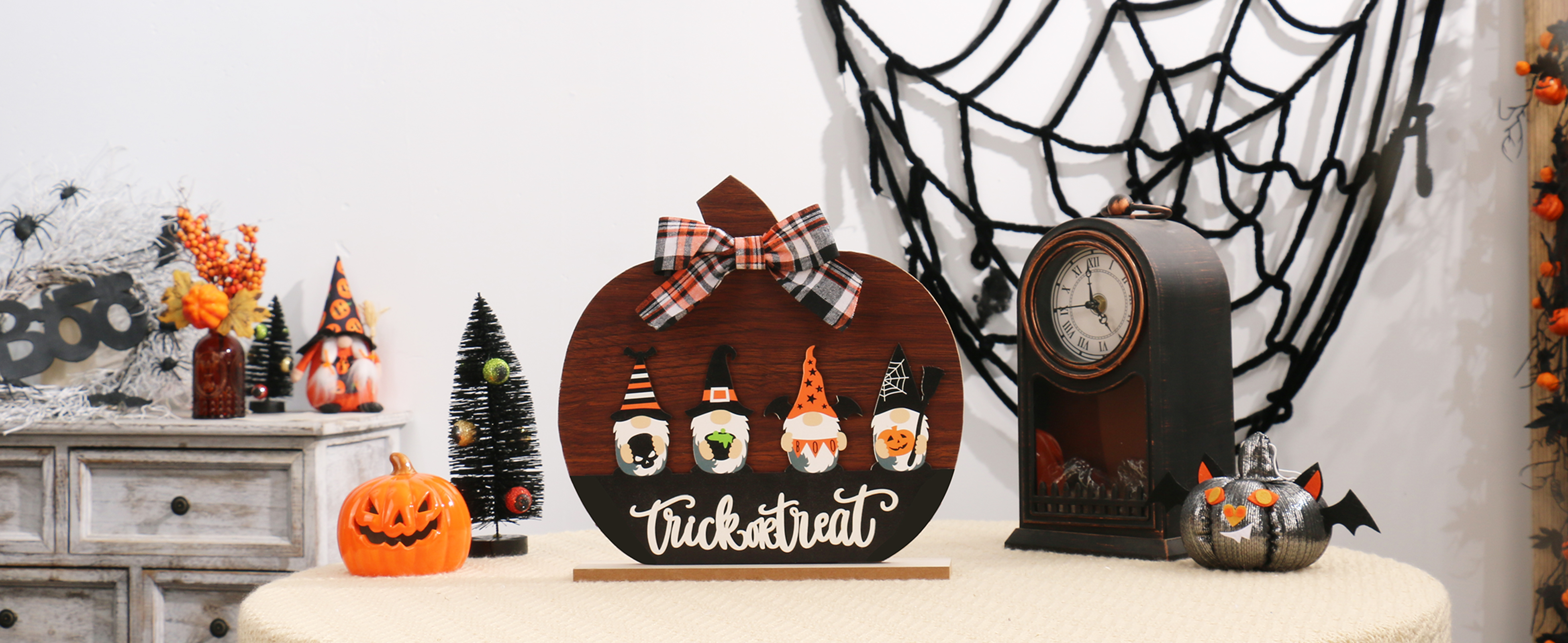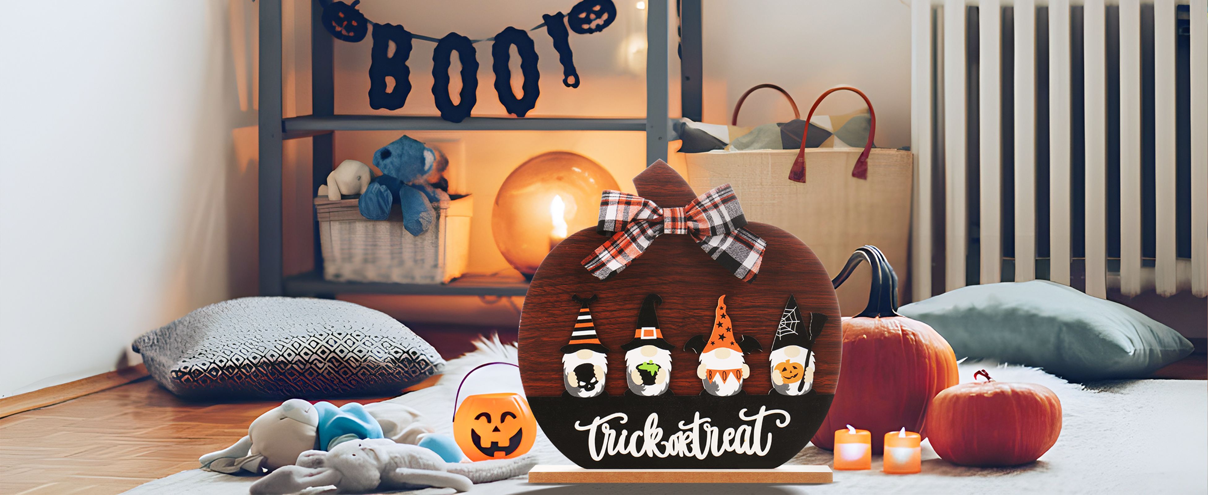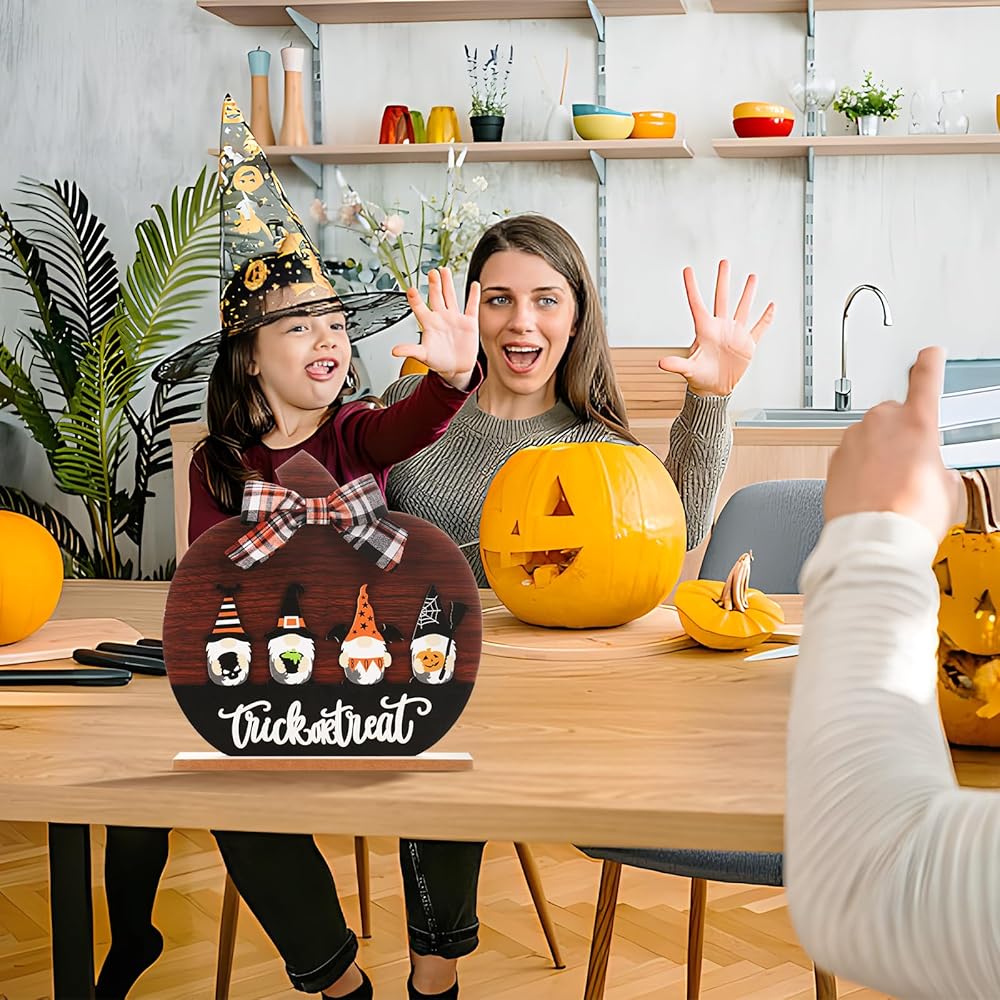 HALLOWEEN DECORATIONS: Whether you are in a modern or traditional home decor style, this Halloween pumpkin decoration sign can be quickly integrated into it. The combination of the pumpkin sign gnome and bow, combined with the popular black and orange colors, creates a visually striking display effect. Make your vacation full of vitality.