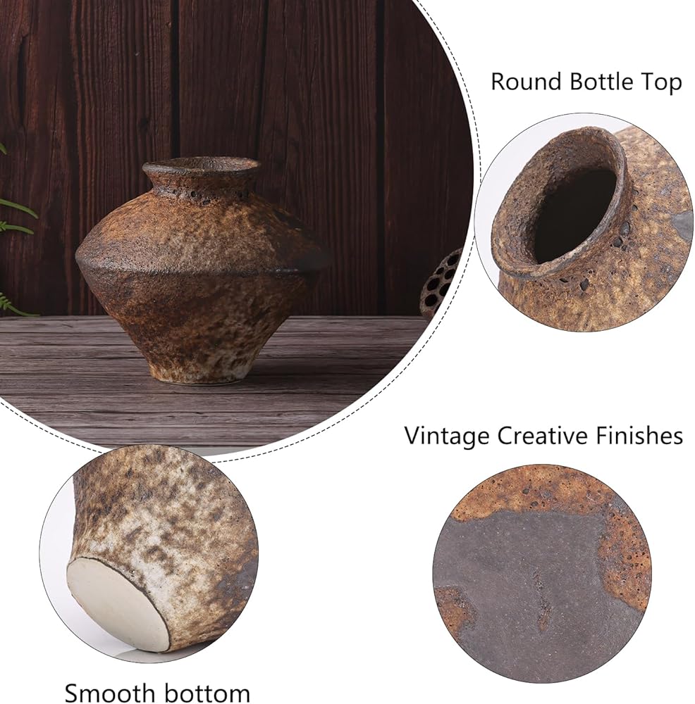 Small Stone Vase for Rustic Home Decor, Farmhouse Antique Pottery Vase Furniture&Table Flower Decorative, Round Terracotta Vases for Living Room Decor, Modern Rustic Concrete Clay Art Vases