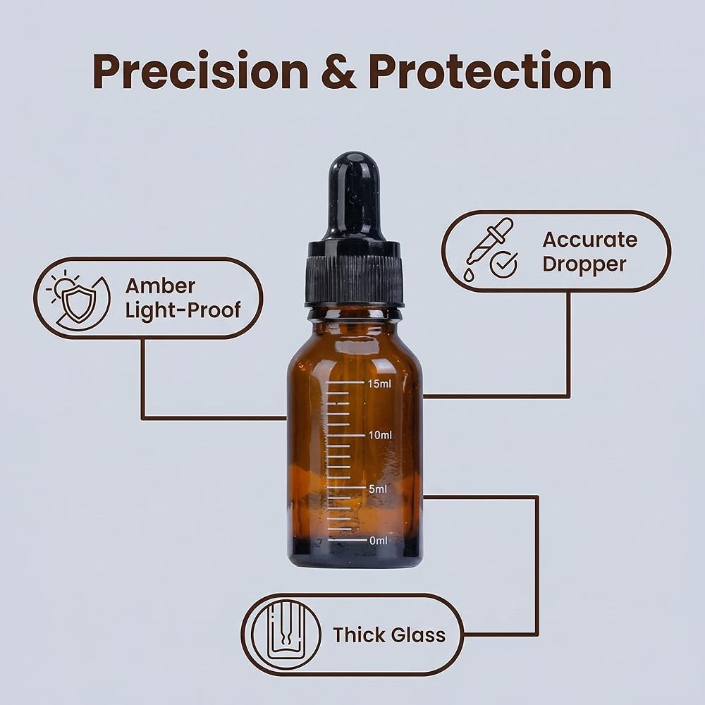 Scientific design and good function, amber glass body can protect the essential oil from sunlight, with clear calibration, more convenient to control the dosage, definetly leakproof, don't worry the oil spill out.