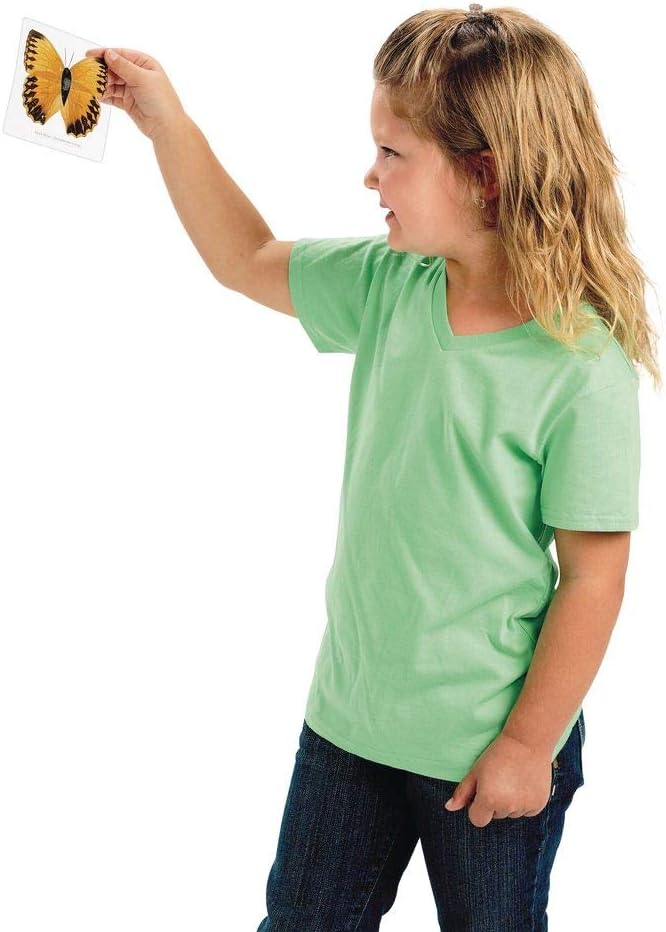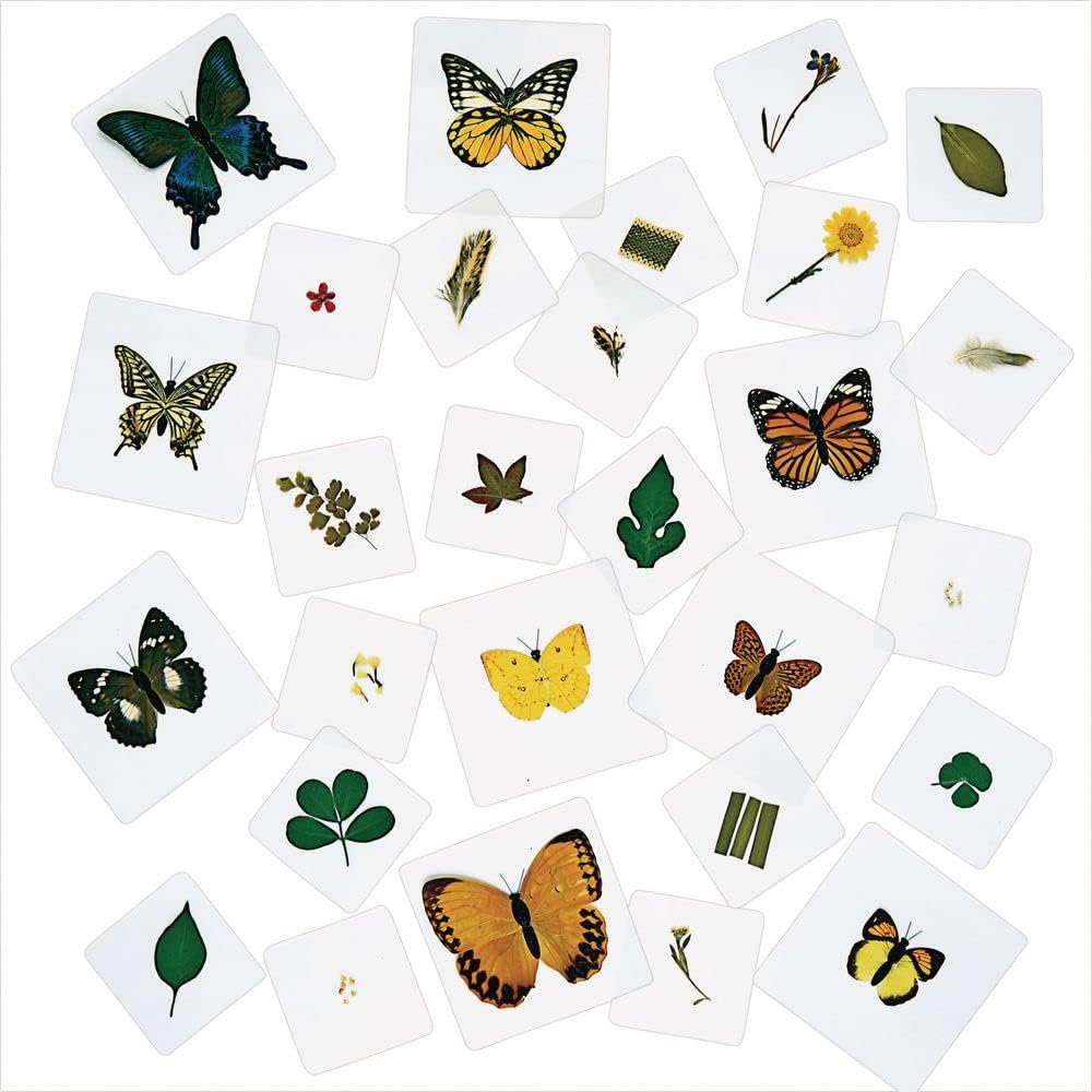 Bring the outdoors inside with an incredible and varied set of specimens for STUDY! safely encased for the classroom use. Use with light tables, microscopes, magnifying Glasses or simple observation. (Includes: snake skin, quail feather, Goose feather, chicken feather, orange leaf, sweet alyssum flower, garden lobelia flower, chrysanthemum flower, viola flower, marigold seed, tomato seed, Chili seed, Chili leaf, maple leaf, adiantam leaf, scratchweed leaf, peanut leaf, Watermelon leaf, rice leaf, common Tiger butterfly, Jungle Queen butterfly, yellow orange tip butterfly, maackii peacock butterfly, lemon migrant butterfly, swallowtail butterfly, spotted saw tooth butterfly, Indian fritillary butterfly and mimathyma schrenckii butterfly; laminating film surface allows children to feel edges of plants or wings inside; set will last over time and real specimens will remain in tact; largest is 4-1/2"sq. , smallest: 3"sq) - discount school supply item # STUDY.