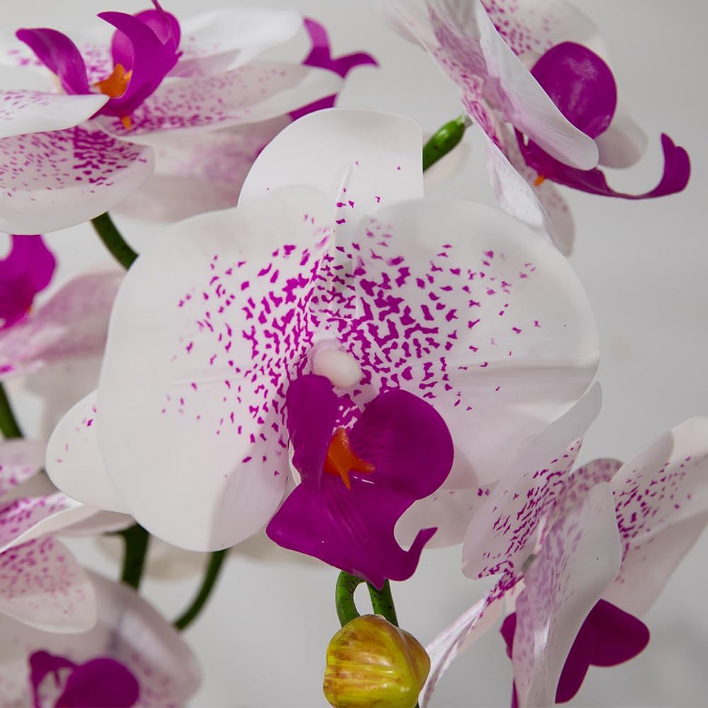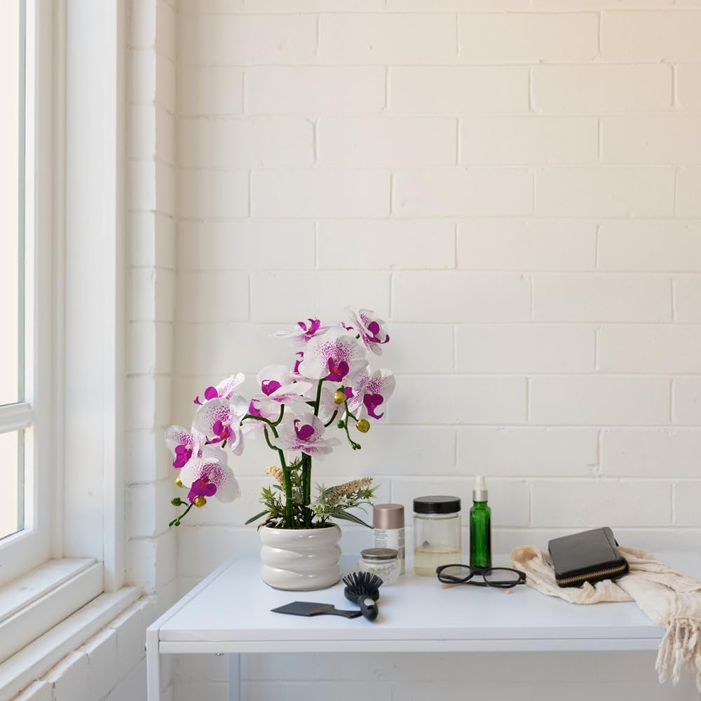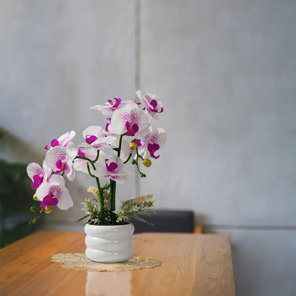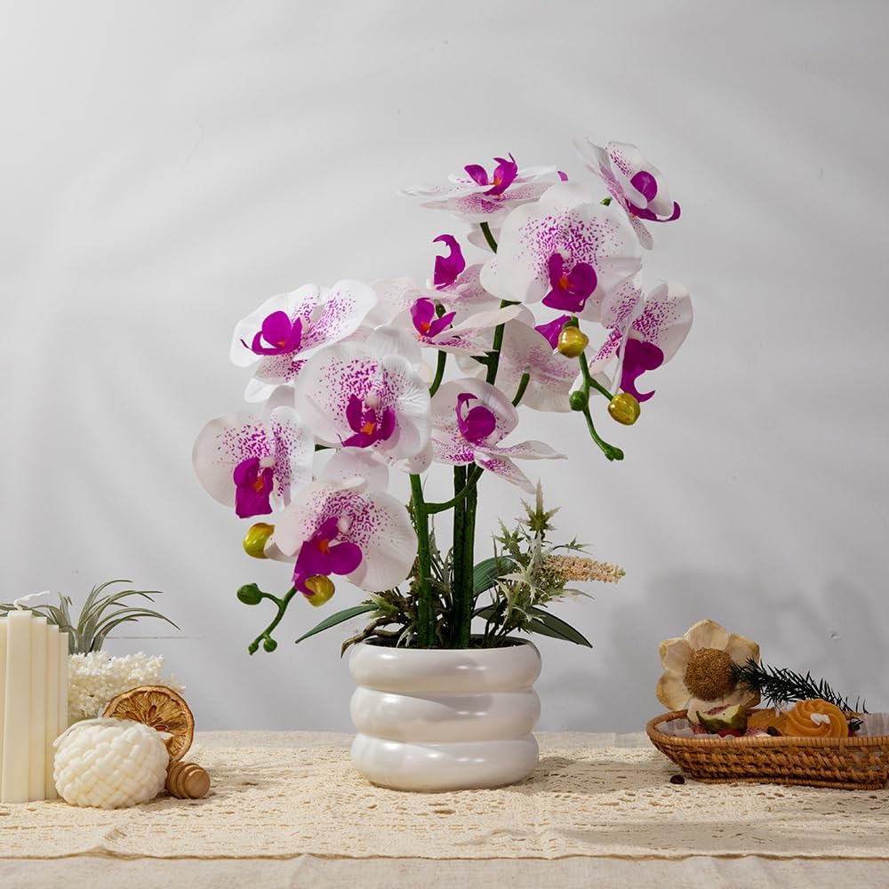 Artificial Orchids Flowers with Vase for Table Centerpieces, Real Touch Faux White Orchid Phalaenopsis in Ceramic Vase for Home Wedding Kitchen Decoration (White Vase, White Purple)