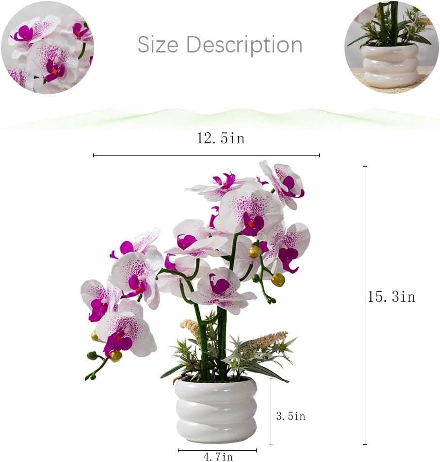 Product Size: Orchid bonsai total height 15.3", wideth 12.5"; pot size: 4.7" x 3.5",diameter of orchid flower: 3.9".