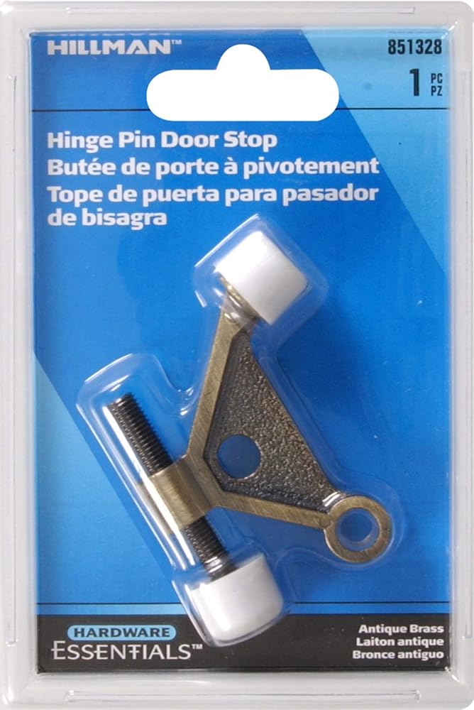 Hardware Essentials Hinge Pin Door Stops are ideal for when there is no base board for traditional door stops or to avoid drilling into custom baseboard pieces. Simply attach to the hinge pin of a door to act as a door stop. Use on solid or hollow doors.