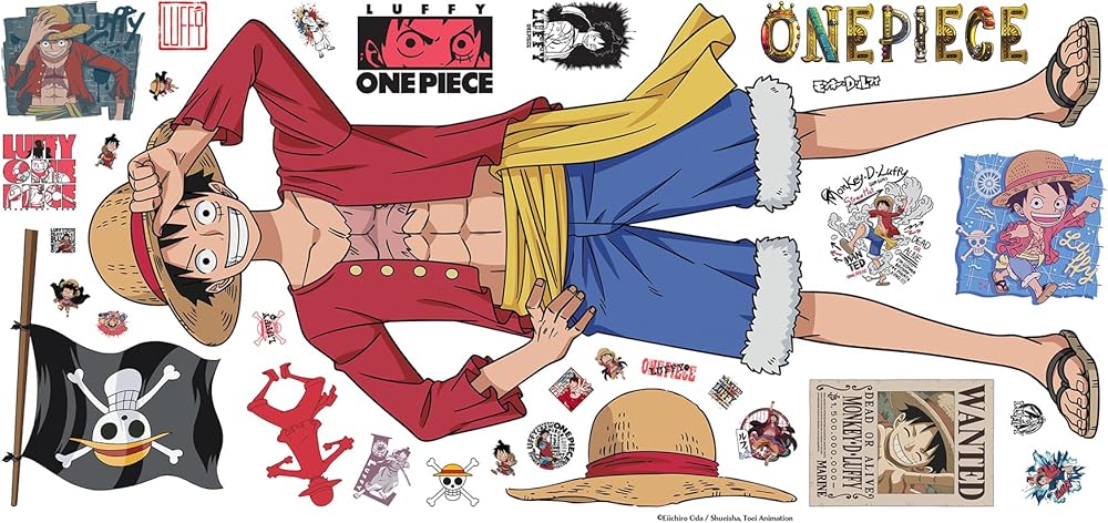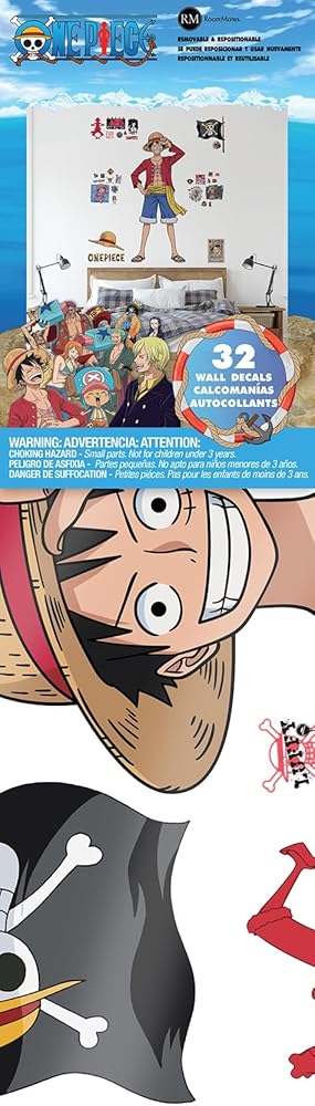 Immerse yourself in the vibrant world of One Piece with this officially-licensed Straw Hat Crew peel and stick wall decal set. Featuring Luffy, Nami, Zoro, and Sanji, along with their signature accompaniments as well as the One Piece pirate flag, this renter-friendly and removable wall decal set is the perfect accent for any fan of the series. Installation is as simple as Peel, Stick…Done!™ One Piece Straw Hat Crew Peel & Stick Wall Decals contains 56 pieces on 4 sheets that each measures 9-in x 17.975-in.