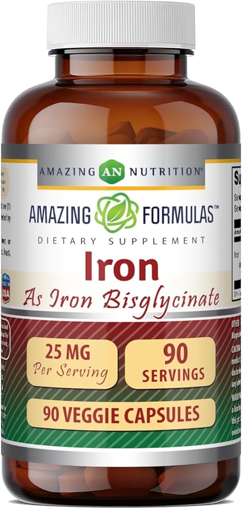 Amazing Formulas Iron as Iron Bisglycinate - 25 Mg Veggie Capsules - Supports Oxygen Supply to Tissues & Organs - Helps in The Formation of Hemoglobin & Myoglobin. (90 Veggie Capsules)