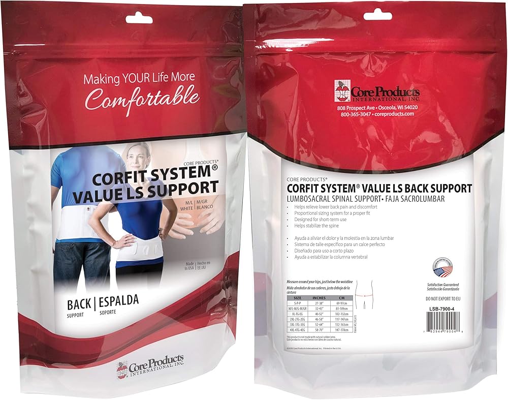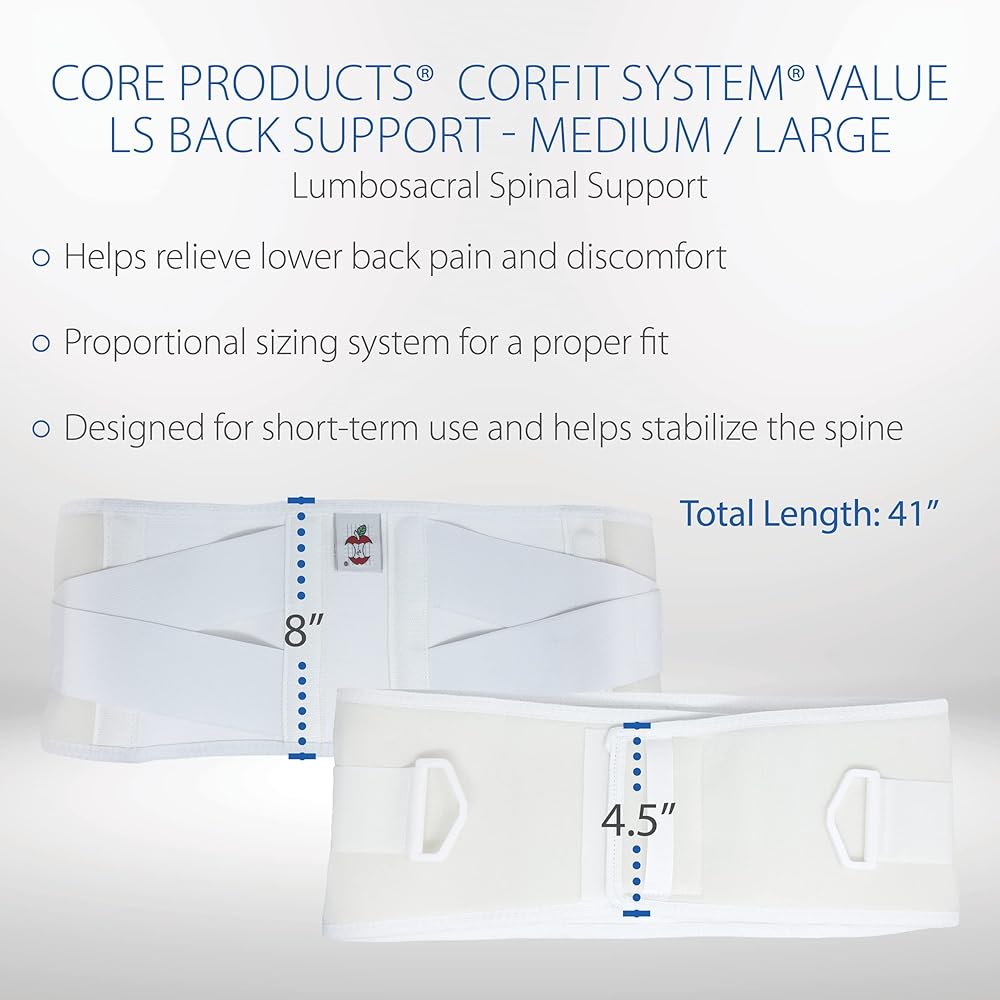 The economically priced CorFit System LS Value Back Support, designed for short term use, helps stabilize the spine to ease lower back pain by creating intra-abdominal pressure. It also helps improve posture and serves as a reminder to use proper lifting techniques by limiting the motion of muscles and ligaments. Our proportional sizing system provides a proper fit in height and length to accommodate various body sizes. Flexible internal stays provide support and stability as well as help prevent the sides from rolling. Lightweight hook and loop provide an economical option for those requiring short-term lower back support. Easy closure assists provide additional leverage with minimal effort for extra compression and a secure fit. Ideal for users with arthritis or weakened muscles. The soft elastic CorEdge finish on top and bottom edges offers added comfort and flexibility. Soft material wicks away moisture, keeping the body cool and comfortable. The anatomical form contours to the natural curves of the waist and hips for comfort. Dual elastic side pulls provide firm compression.