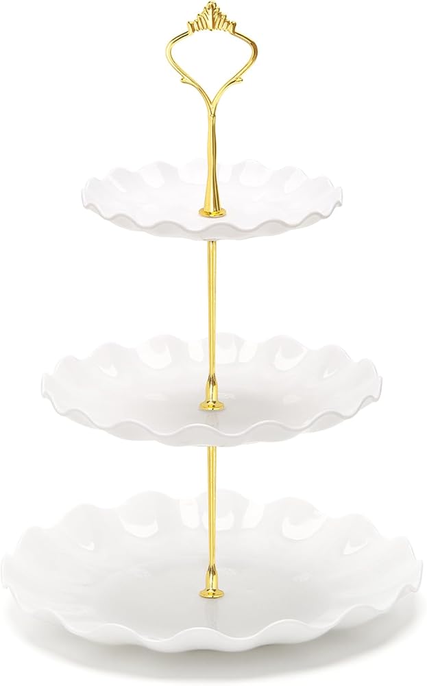 Elegant Design:Tiered serving stand are carved with wavy edges, the surface is smooth and shiny, full of elegant and romantic feeling. Crown handle design, easy to carry.