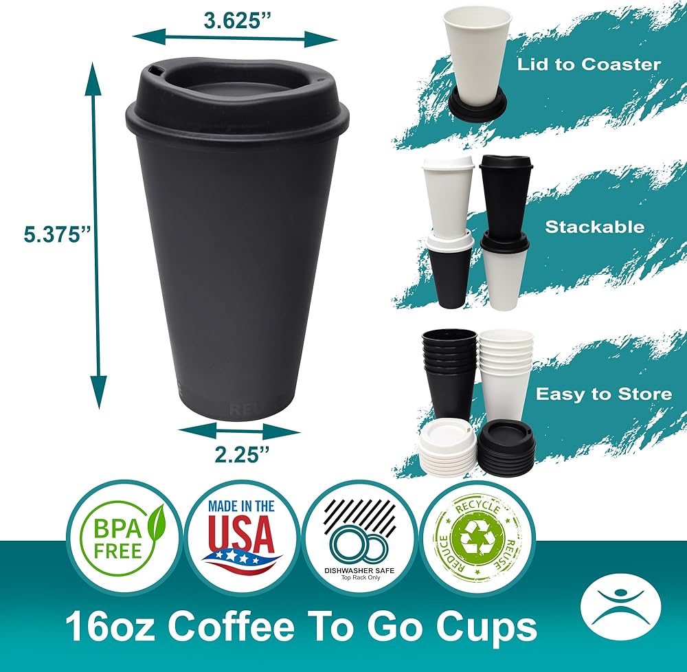 MANY USES - Our lightweight and sleek on-the-go cups are the perfect choice for all hot and cold drinks from coffee and tea to seltzer and soda. Snap-On lids are also serve as coasters to protect your desk or table