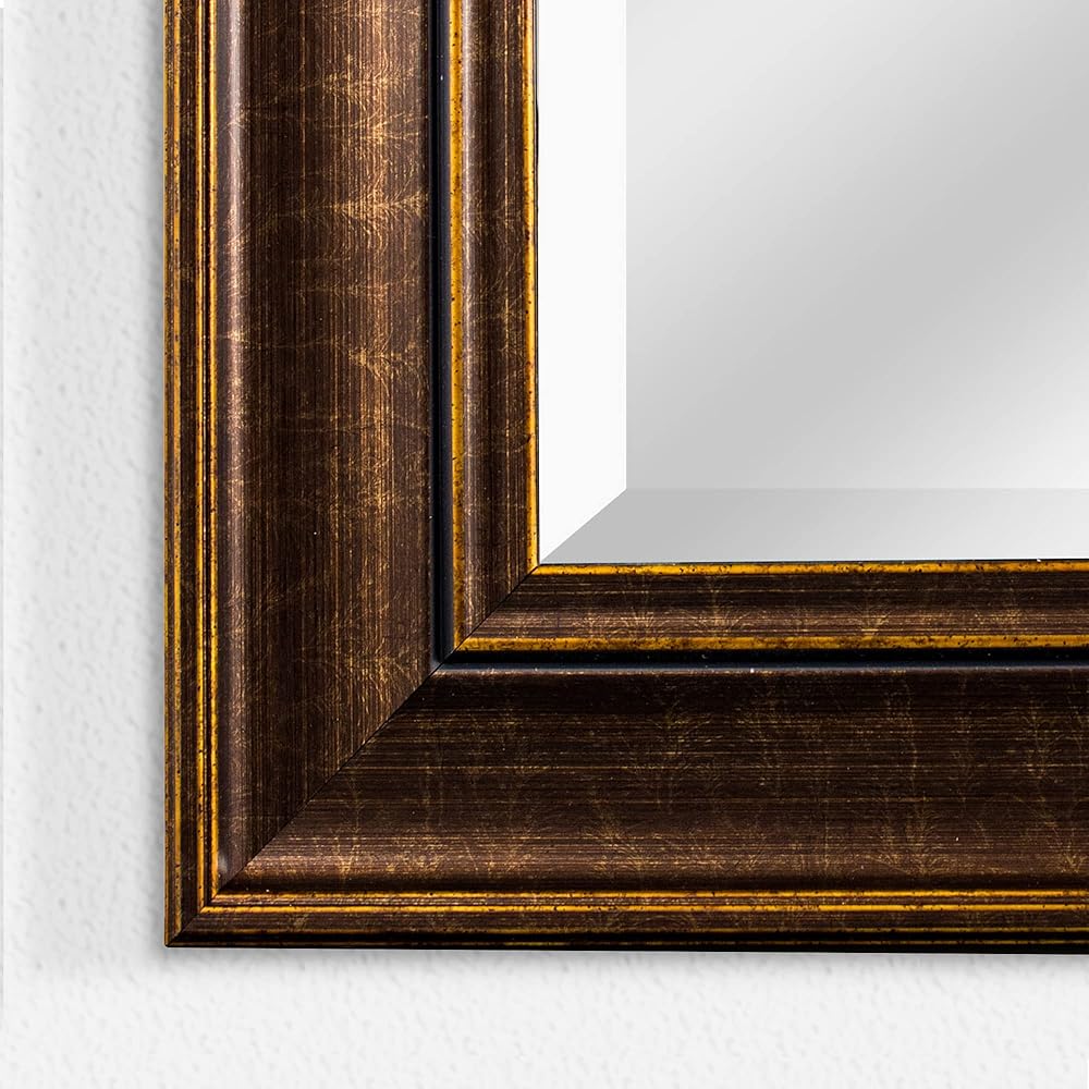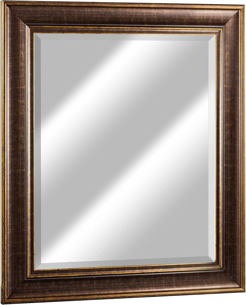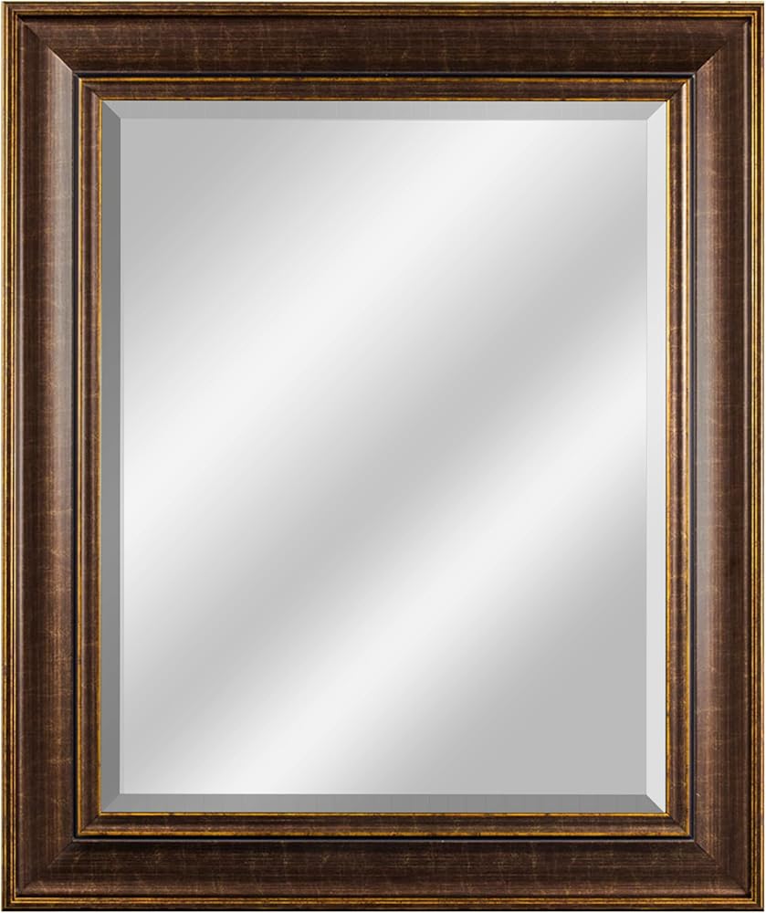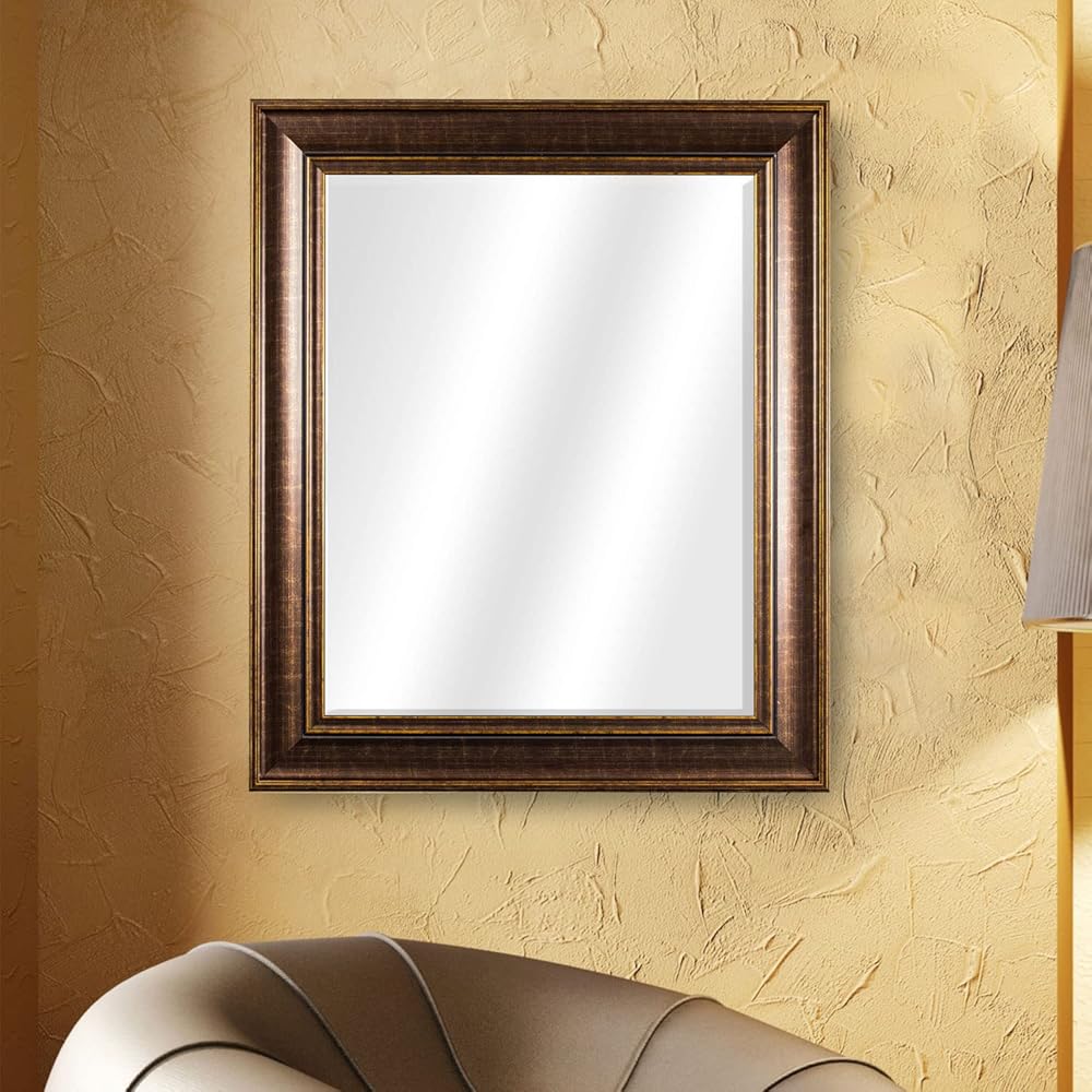 Elevate your space with a mirror that's unique, elegant, and eye-catching, like this lovely bronze two step mirror. This wall mounted bronze beveled mirror is enclosed in a frame with deep espresso, copper, and gold accents within an oil-rubbed bronze finish. The piece comes with luxurious beveled edges that give the mirror an additional touch of sophistication. This mirror size works beautifully as a bathroom vanity mirror or adorning your living room and hallways as an accent mirror. The mirror mounts easily using D-rings and can be mounted horizontally or vertically.