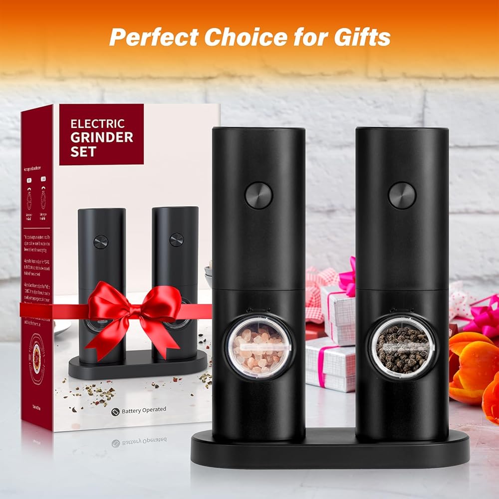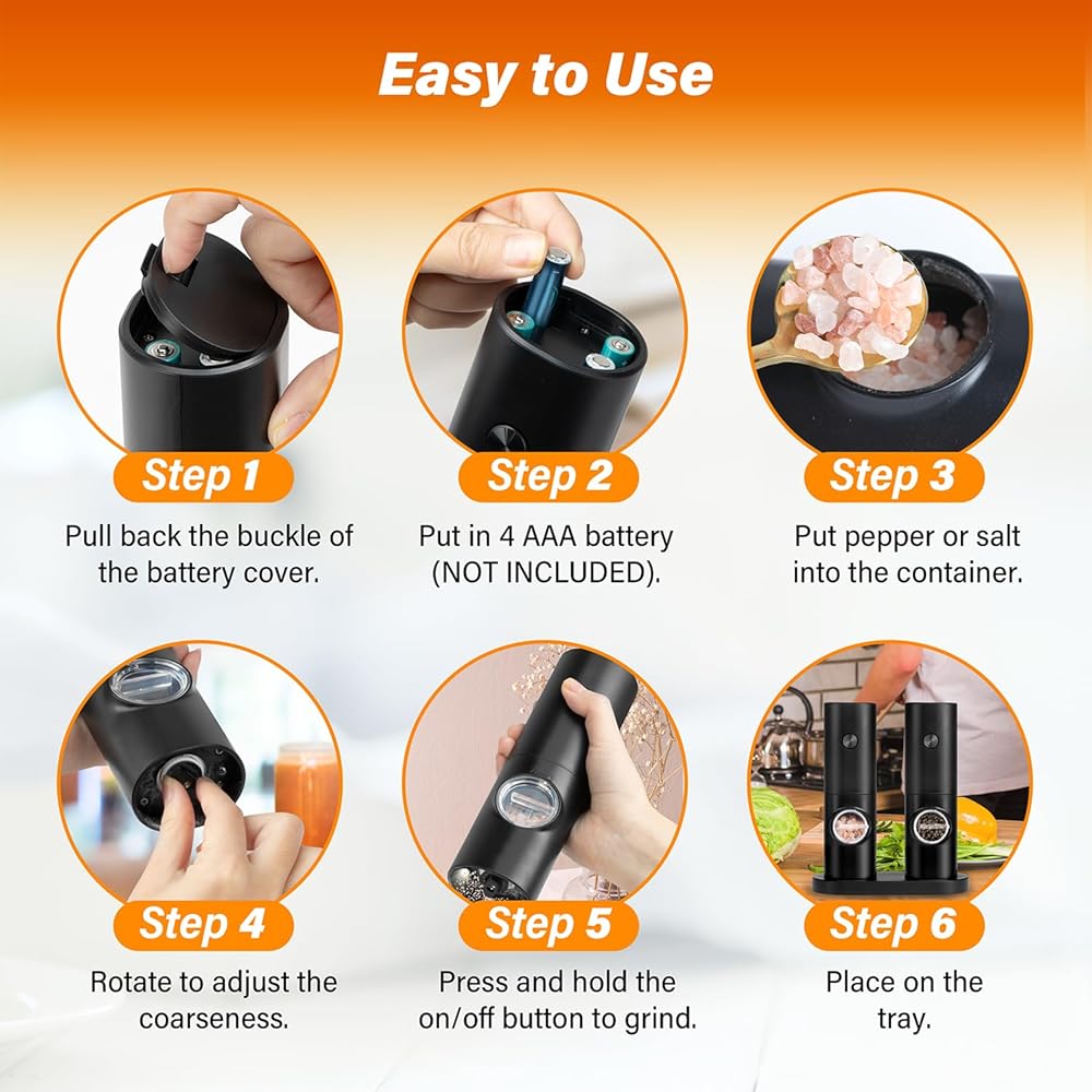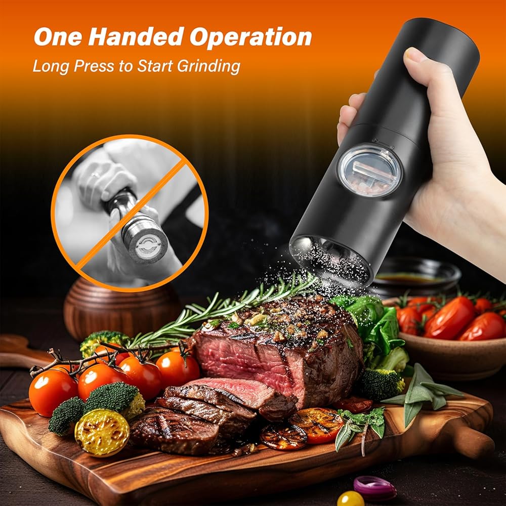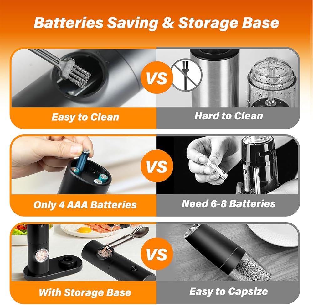 【Gravity Sensor Design & Battery Operated】 Electric salt and pepper grinder set adopts gravity induction design, requires 4x AAA batteries (not included). Just simply flipped the grinder with one hand and you will get fresh spices. Easy to use.