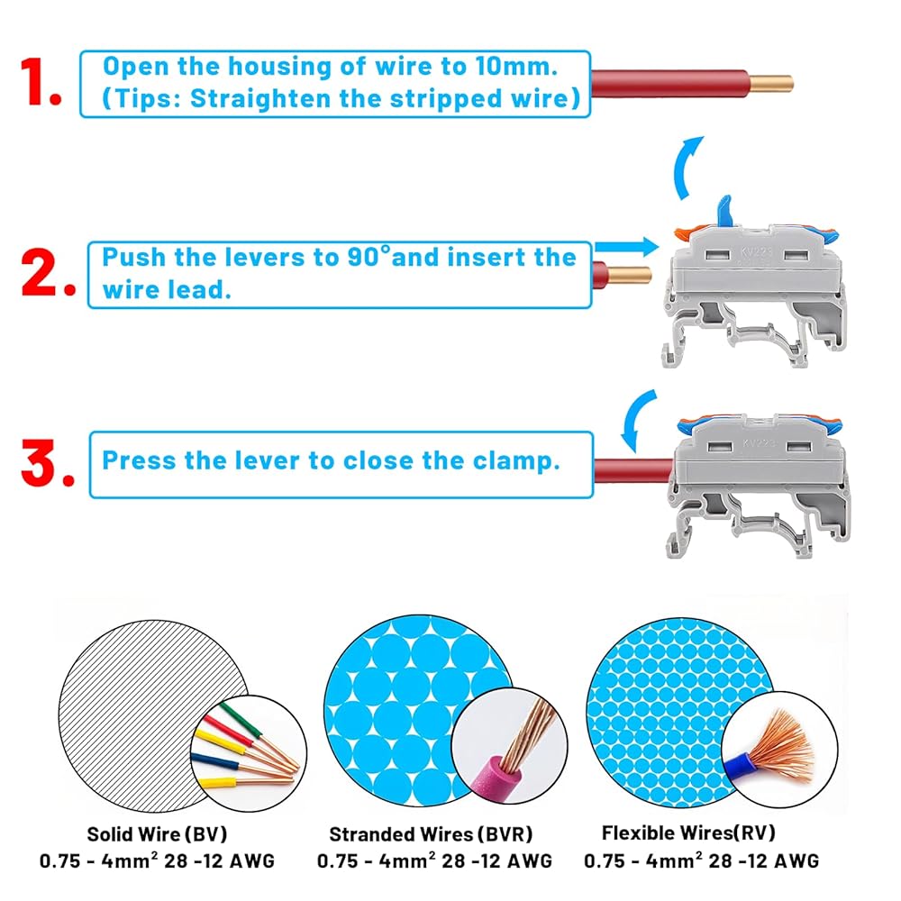WIDELY USED: Suitable for wire size 0.08~4mm²/AWG28-12. Used to connect braided and solid wires of various sizes, this connector is a versatile tool for various electrical applications, such as household wiring for ceiling fans, sockets, switches, vehicles, motorcycles, ships, loudspeakers, lamps, electrical boxes, chandeliers, light switches, fan controls, and more. With its compatibility to work with most household wiring, this connector is a must-have for those looking to make electrical connections easily and effortlessly.