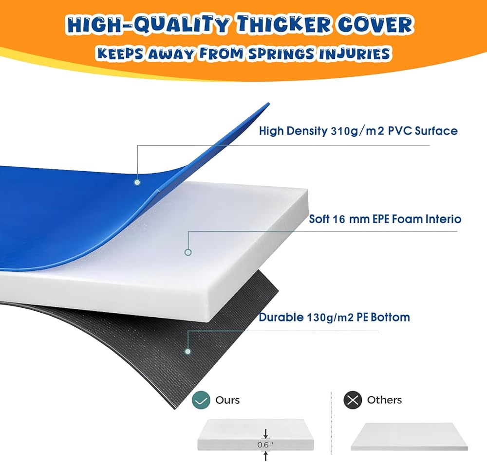 【Designed for Kids' Safety】Our outdoor trampoline pad replacement is specifically designed with children's safety in mind. This 12 FT trampoline replacement pad which the surface is made from soft 320gsm PVC material, effectively preventing children from being hurt by springs that could cause injury while jumping. Additionally, this trampoline pad 12 Foot is filled with 0.6 inches of thick EPE foam, which provides excellent shock absorption during jumps, creating a safer jumping environment
