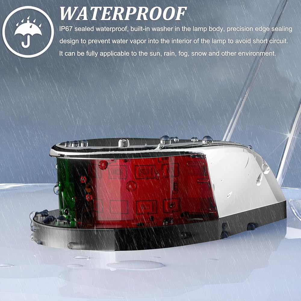 Boat Bow Navigation Lights Red and Green Led:IP67 waterproof, 12V DC voltage, power is 6W. Built-in high-light 12LED F5 lamp beads, radiation Angle is 225 degrees, luminous color is red + green. Innovative surround light pearlescent design provides high brightness signal lighting, eye-catching red and green warning signal light source escorts the ship