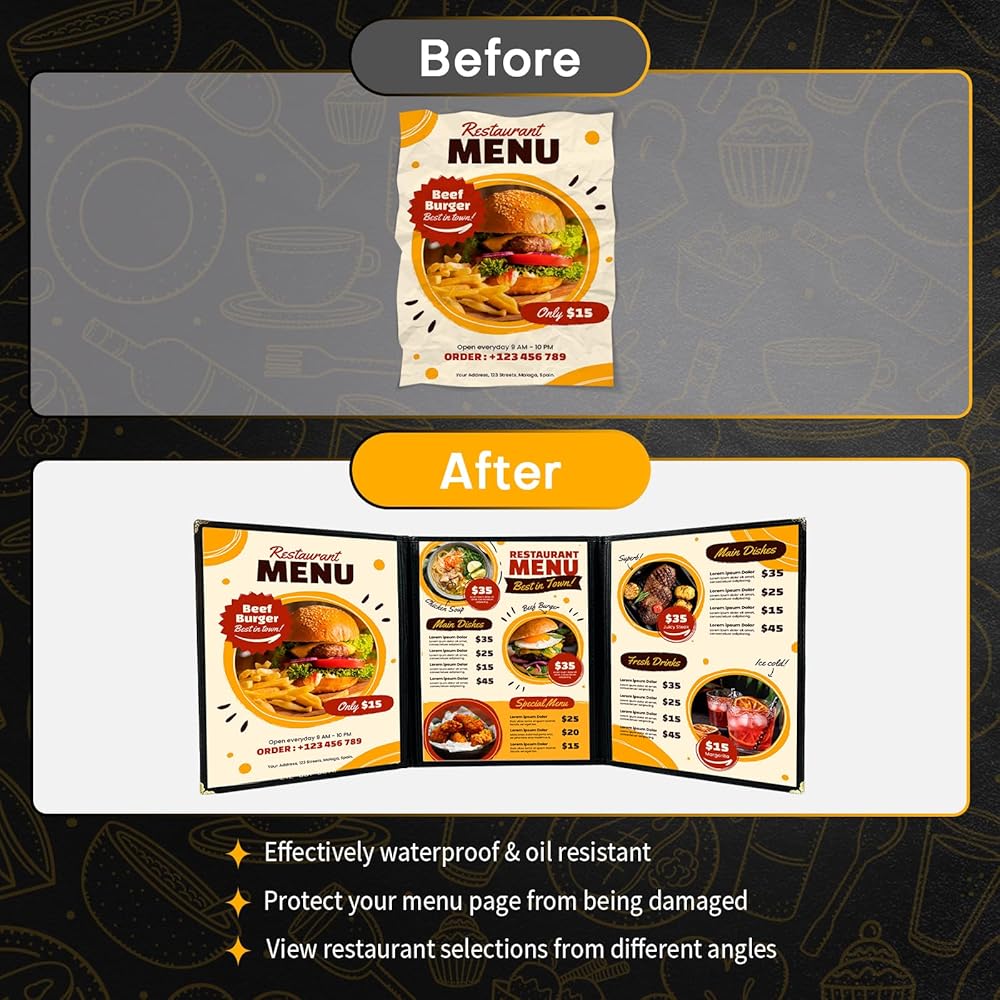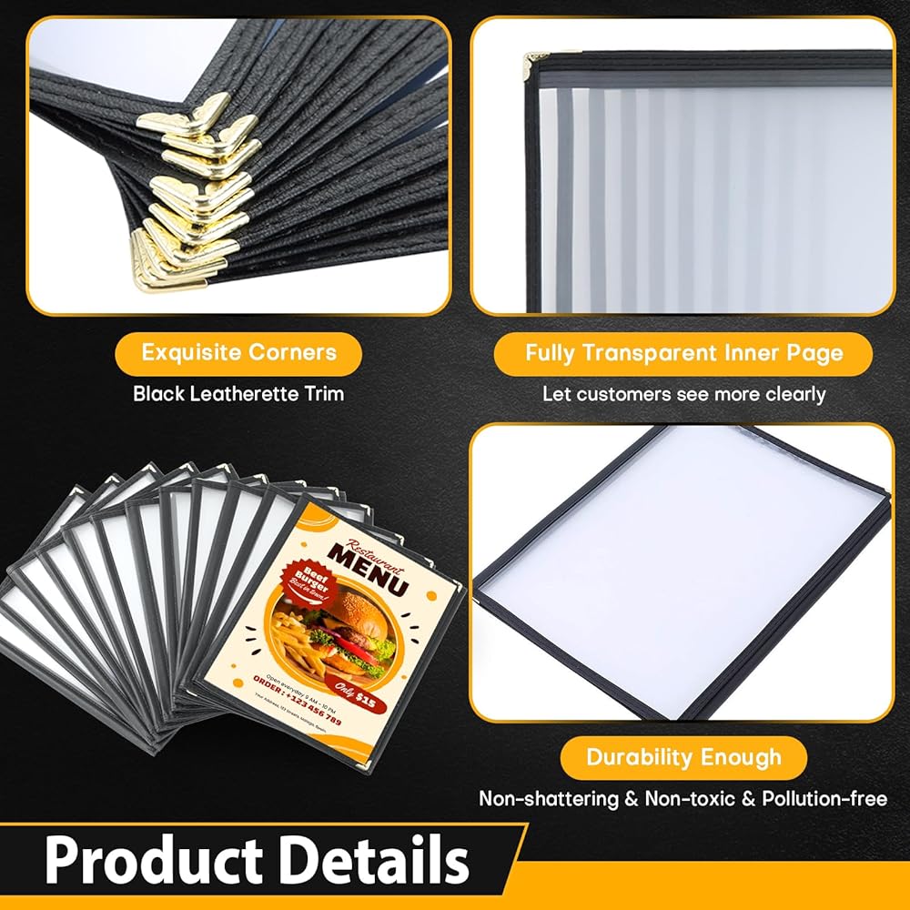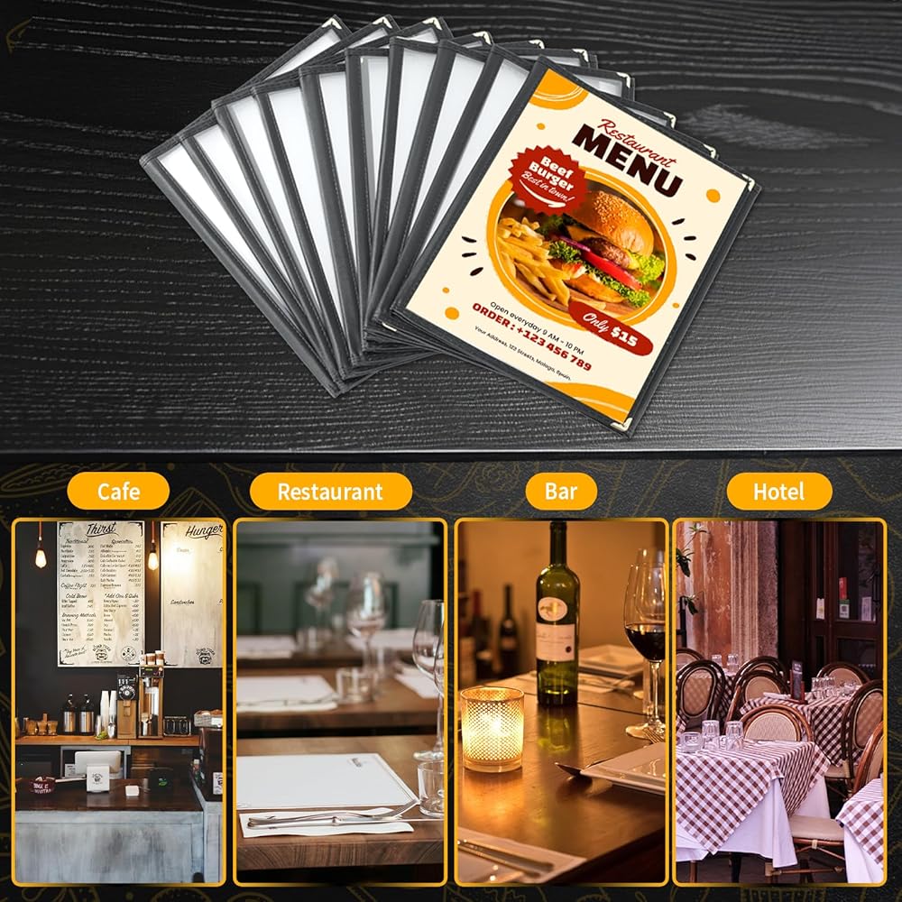 Enhanced Look - Crafted from environmentally friendly, waterproof, and scratch-resistant PVC, these menu covers not only protect your menus but also impress your customers with a professional and tidy menu display.