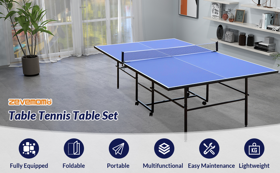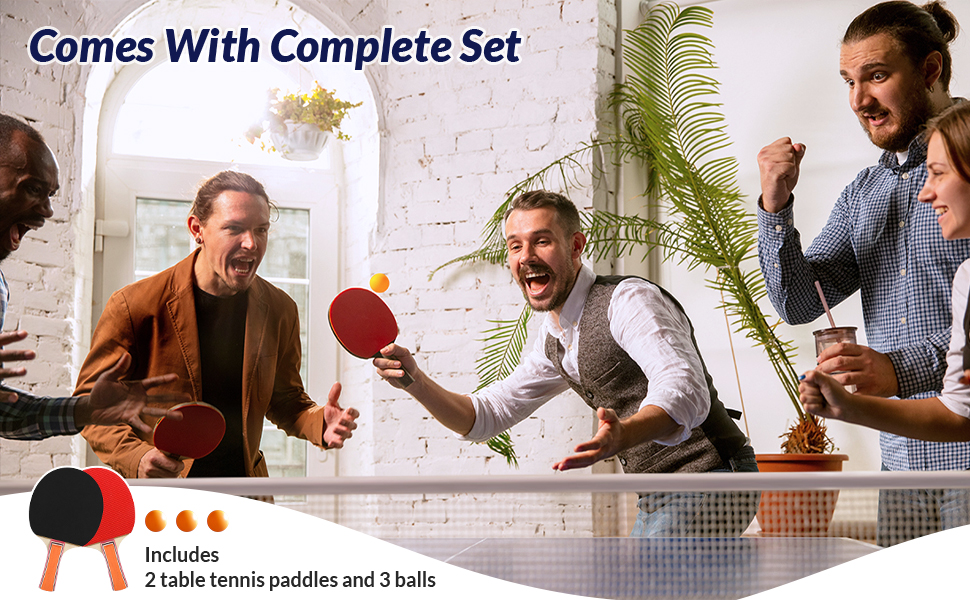 【Table Tennis Table Set】The package includes everything you need: a ping pong table, net, 2 paddles, and 3 balls. With all components pre-assembled, there's no need for complicated tools—just unfold the table, and in minutes, you're ready for a match!