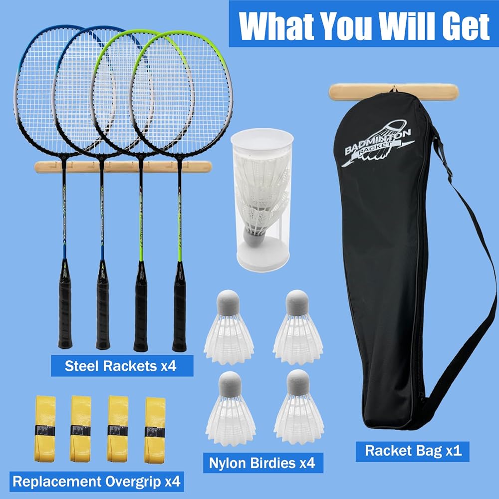 【Package Includes】 4 badminton racquets, 4 durable nylon shuttlecocks, 4 replacement grip tapes and 1 large carrying bag. Convenient for you have fun with family friends in the backyard or anywhere.