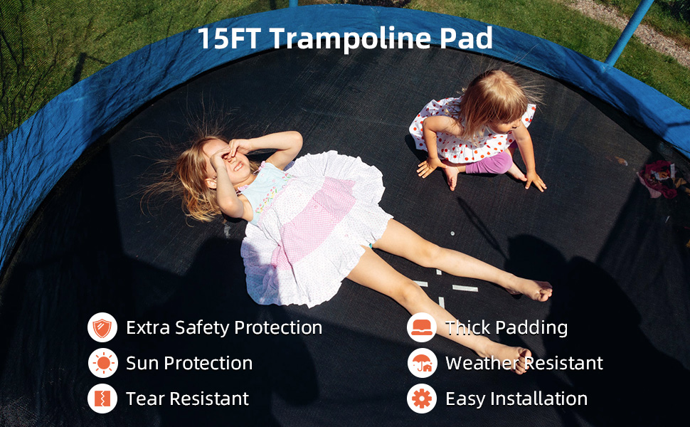 سهل التجميع والاستبدال: غطاء زنبركي الترامبولين بطول 15 قدم سهل التركيب ويقطع العديد من خطوات التجميع المملة؛ كل ما عليك فعله هو وضعه بشكل مسطح على الترامبولين وتأمين الحبال المرنة؛ كما أنه من السهل إزالته، لذلك يمكنك أخذه معك أثناء التنقل أو تغييره حسب الموسم! لن تضيع عملية الاستبدال البسيطة الكثير من وقتك أو طاقتك.