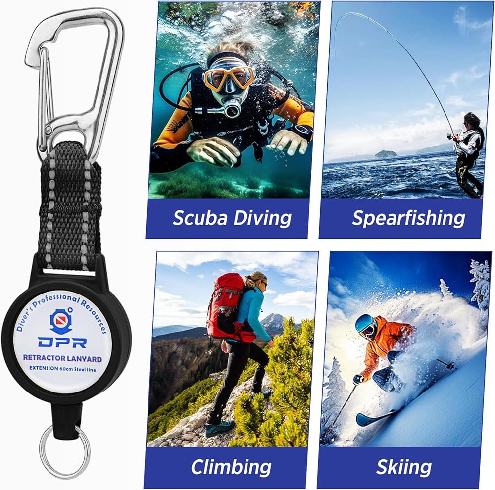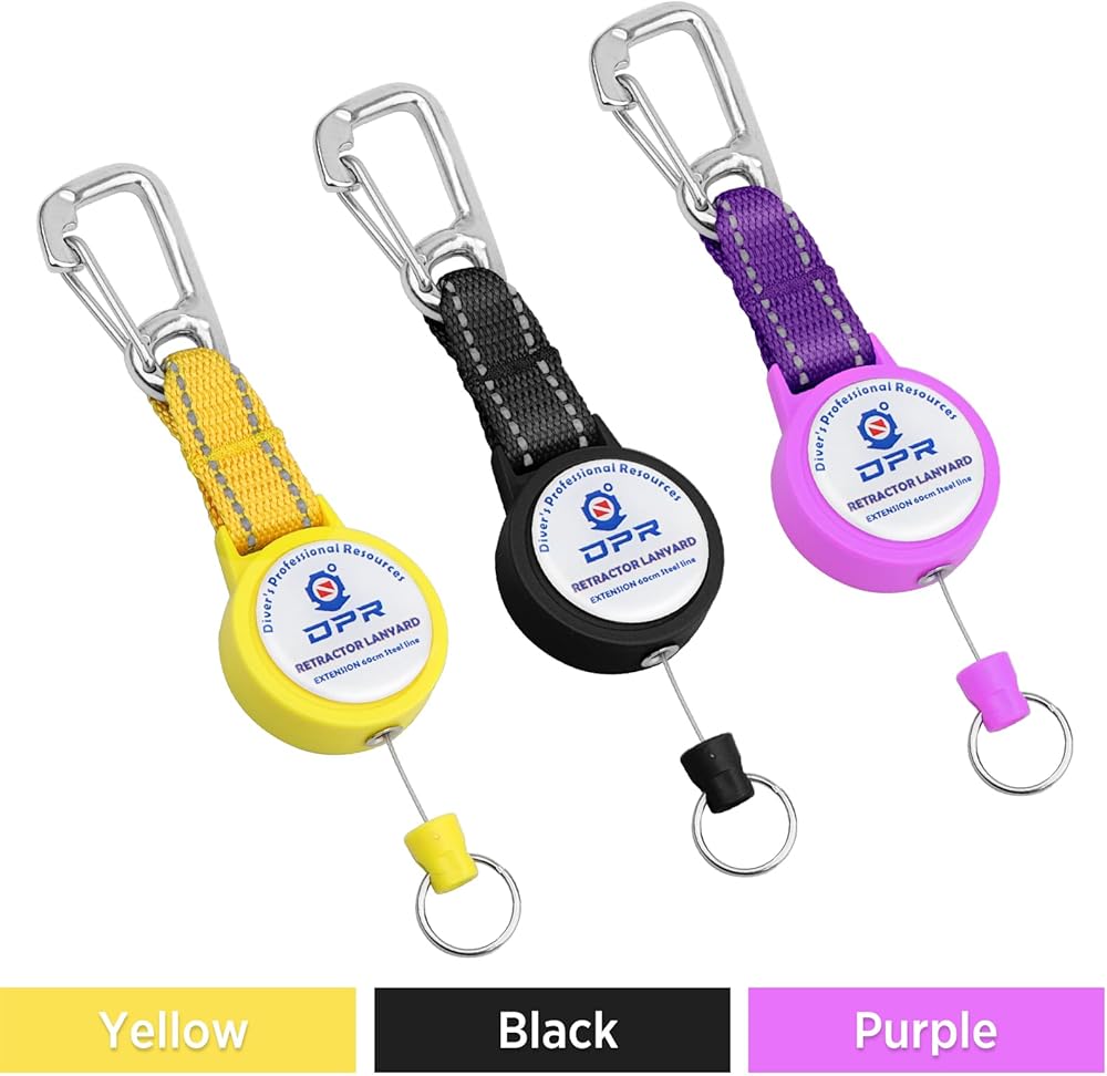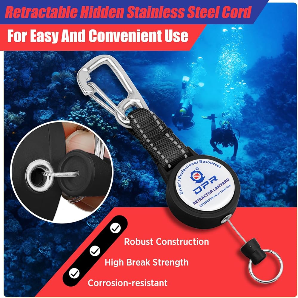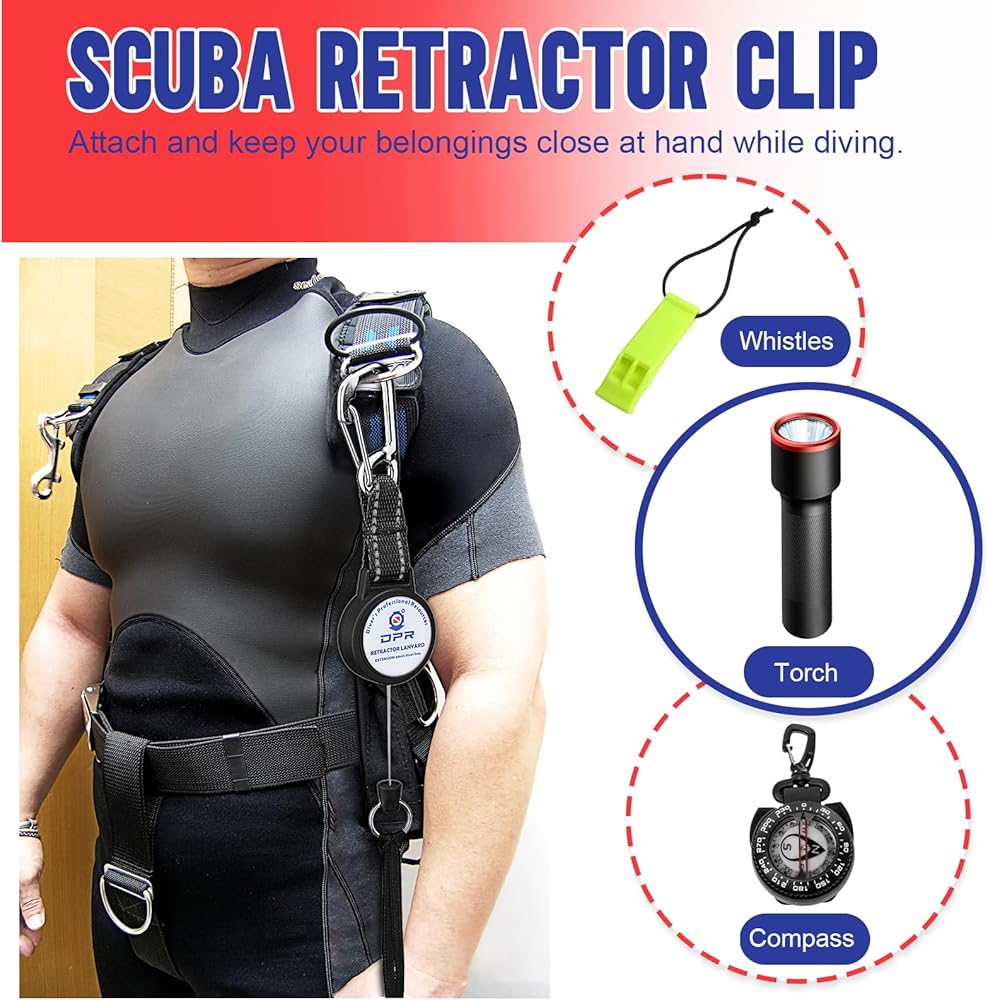 SCUBA RETRACTOR CLIP - Our retractor is used to attach dive accessories to your BCD and quickly access use underwater. Just pull the accessories to extend the retractor cord, and retract back again when released to keep your dive gear organized and within reach.