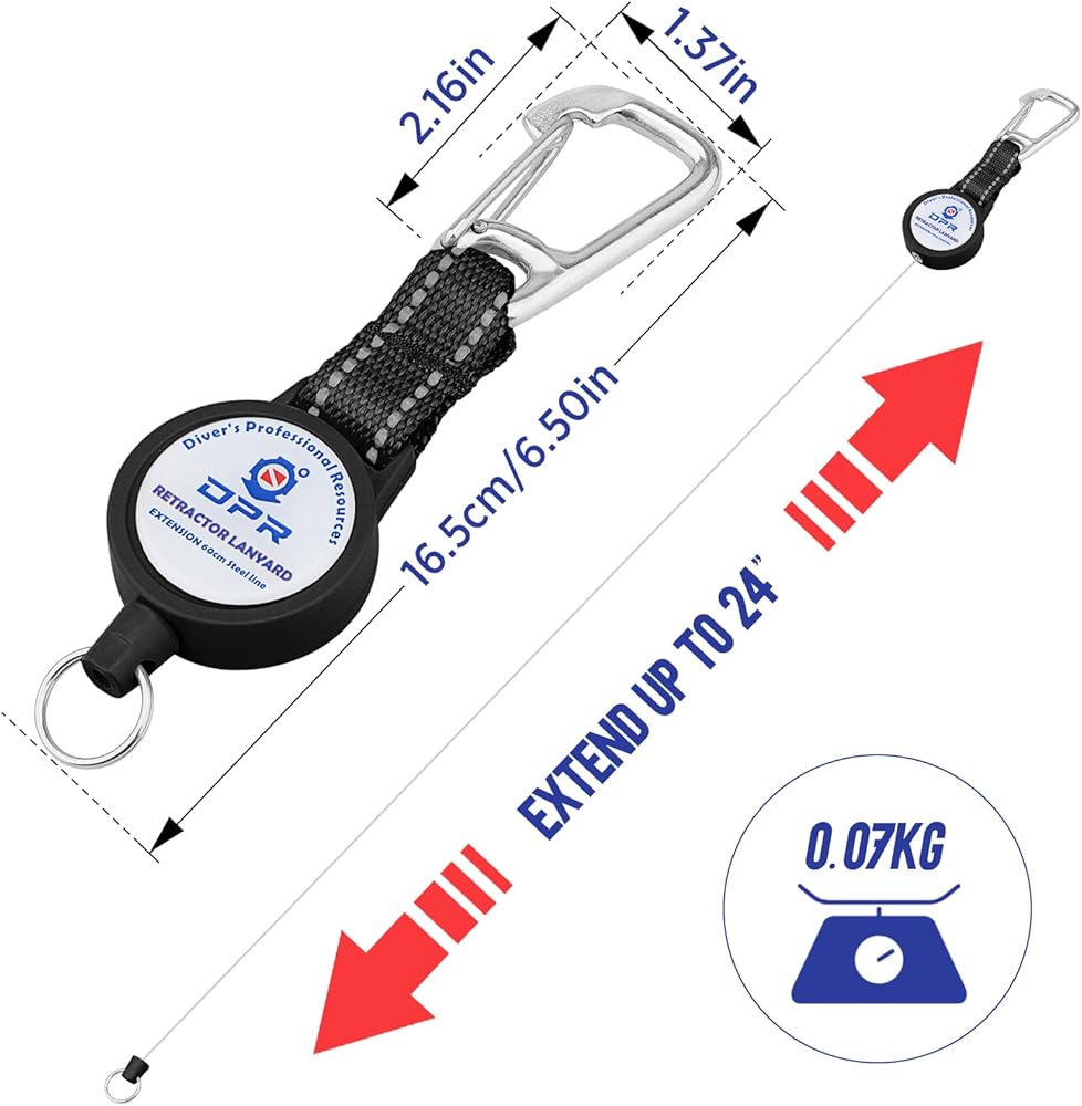 Scuba Diving Retractable Retractor Lanyard Clip Nothing's worse than having a favorite dive light or item slip out of your hand and you have to watch helplessly as it disappears into the depths. This won't happen if your gear is clipped to this retractor. OUR retractor Features a 3/4" Heavy Duty 316 stainless steel snap clip, this retractor securely attaches to your BCD or vest, ensuring your equipment stays close. The quick-release clip allows for rapid detachment from devices, enhancing convenience during dives. It includes a 316 stainless steel key ring for attaching an exposure meter, octopus, Flashlights, Gauges, computer, compass, Whistles, lobster gauges, and similar clip-on gear. Specification: Item Type: Diving Buckle Material: 316 Stainless Steel+Plastic Extension: Extend up to 60cm/24inch long Pull Force: 17.6 ounces/500g Split Ring Diameter: 2cm/0.79 inch Package Included: 1x Scuba Retractor Clip