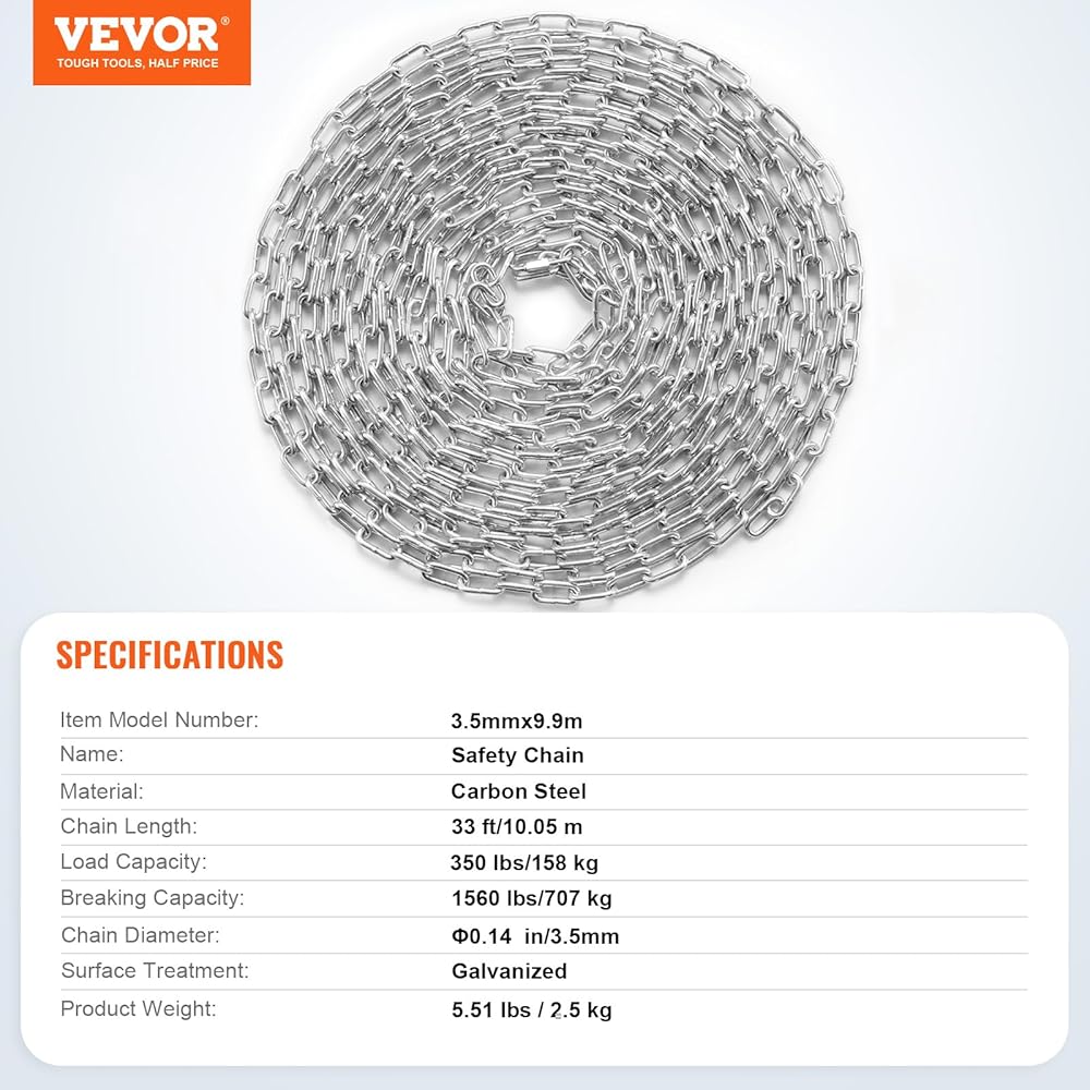 VEVOR Proof Coil Chain, 1/8" x 33', 350 lbs Safe Working Load, Zinc Plated Proof Tested Coil Chain with Two Quick Links, Galvanized Carbon Steel Link Chain for Towing, Hanging, Camping, Pet Towing