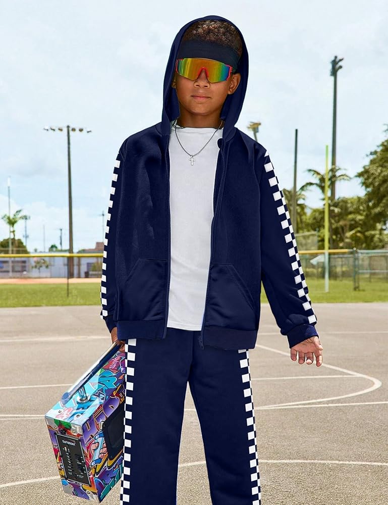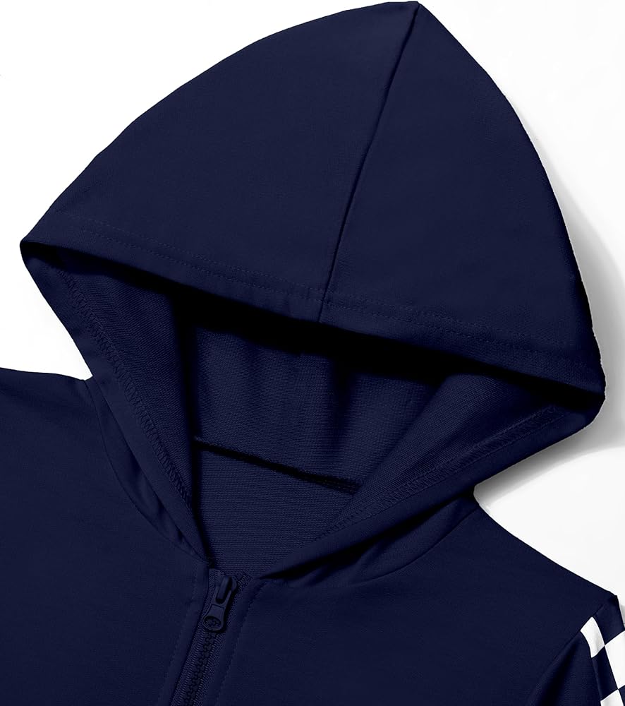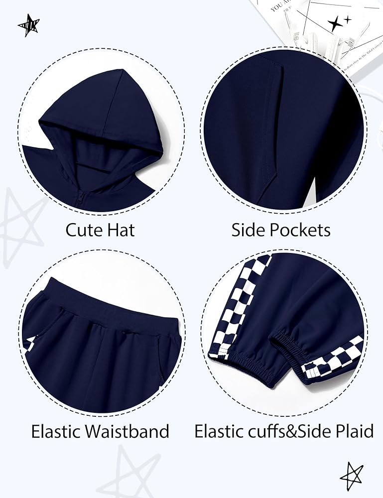 【Unique design】The girls outfits have prominent design:Long Sleeves Hooded Sweatshirt and Plaid Sweatpants with Functional Pocket, Zipper Closure, Elastic Waist.This tracksuit has Side Plaid Stripes, a stylish and casual look that makes your girl more attractive.