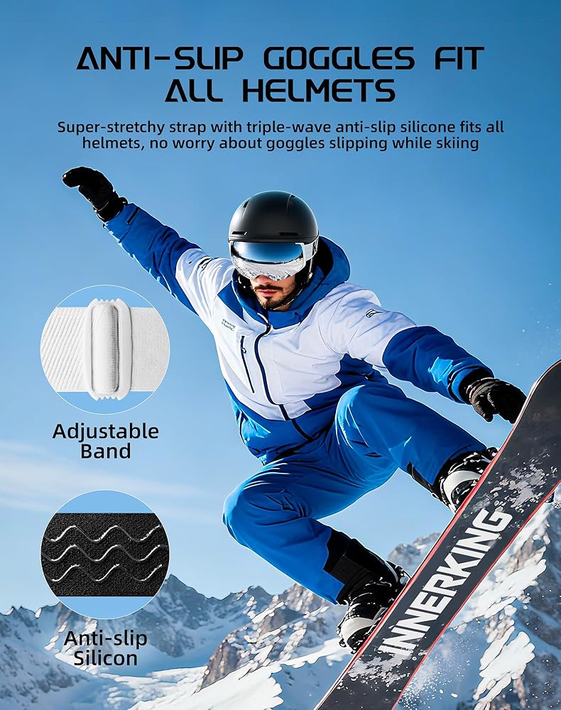 حزام متوافق وقابل للتعديل: نظارات تزلج بنمط سيليكون غير قابل للانزلاق. تعمل الأشرطة الطويلة للغاية المصنوعة من قماش الجاكار ثلاثي الأبعاد عالي الكثافة على تعزيز قبضة الخوذة. أحزمة نظارات التزلج قابلة للتعديل. متوافق مع معظم خوذات التزلج. إطار من مادة TPU الممتازة مع إسفنج ثلاثي. نظارات التزلج على الجليد هذه مناسبة أيضًا للنساء والرجال البالغين والمراهقين.
