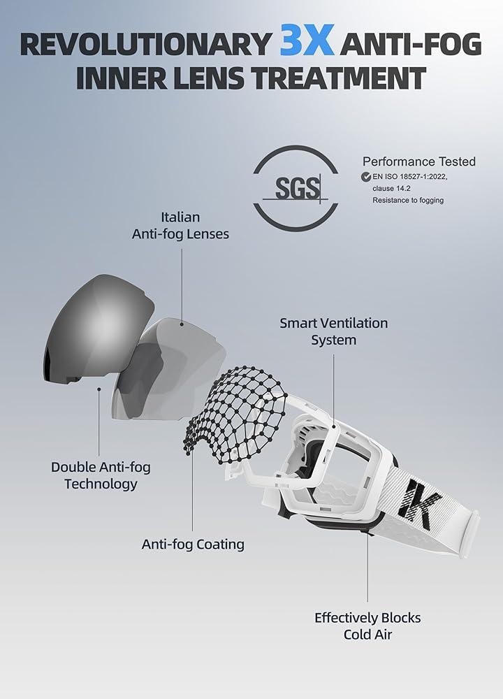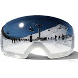 حماية من الأشعة فوق البنفسجية ومضادة للضباب: تصميم عدسة مزدوجة، سطح خارجي من البولي كربونات مع تأثير مرآة فائق الوضوح. عدسات عاكسة مضادة للخدش، ومضادة للضباب، ومضادة للصدمات، ومغطاة بمرآة لكامل الوجه، وحماية 100% من الأشعة فوق البنفسجية، وأكثر متانة من نظارات الثلج الأخرى. العدسة الداخلية مصنوعة من مادة إيطالية احترافية مضادة للضباب تدوم طويلاً مع نظام تهوية. لا تعفير أثناء التزلج. تصميم عدسة أسطوانية مع وضوح بصري ممتاز لمجال رؤية واسع للغاية.