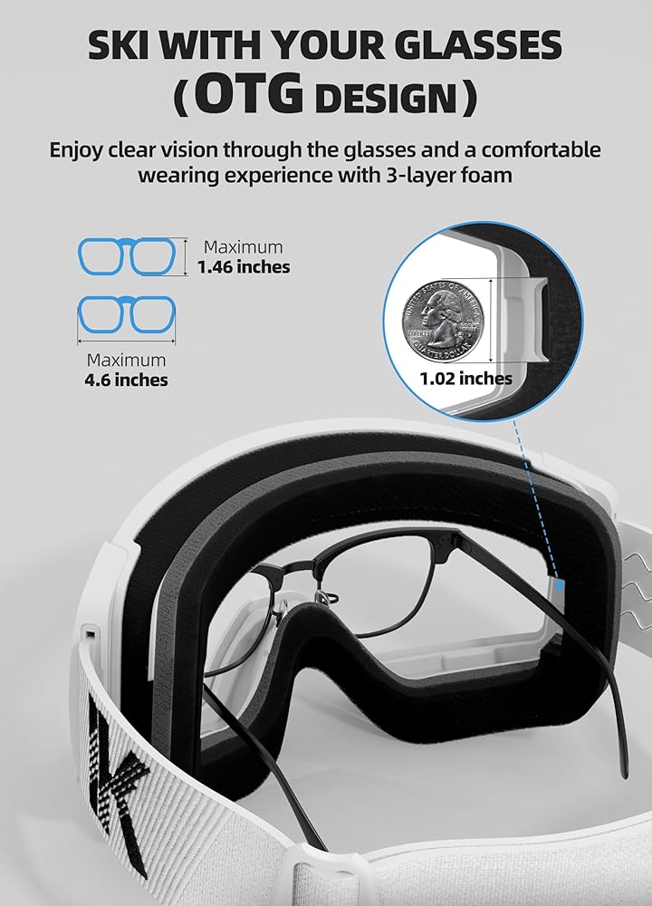 تصميم فوق النظارات: مع تصميم OTG (فوق النظارات)، تسمح لك نظارات التزلج للبالغين بارتداء نظارتك تحت نظارات التزلج على الجليد. إنه مثالي للتزلج، والتزلج على الجليد، والتزلج على الجليد، وتسلق الصخور، وركوب الدراجات النارية/الجبال، والقيادة على ارتفاعات عالية، والقفز بالحبال، وغيرها من الرياضات. تتمتع نظارات التزلج هذه بزاوية رؤية واسعة للغاية ووعي محيطي جيد، وهو أمر مهم بشكل خاص لتحسين الوعي على المنحدرات.