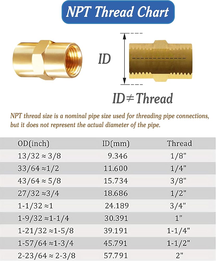 【Easy Installation】This fitting comprises a brief segment of pipe, featuring threaded extremities designed for joining pipes with matching threads. Centrally, it incorporates a hexagonal cross-section, which facilitates a larger bearing surface area, enabling effortless adjustment with a wrench. Kindly note that the NPT Taper Thread Size is indicative of a nominal pipe size and does not correspond directly to the actual diameter. Please refer to the size chart.