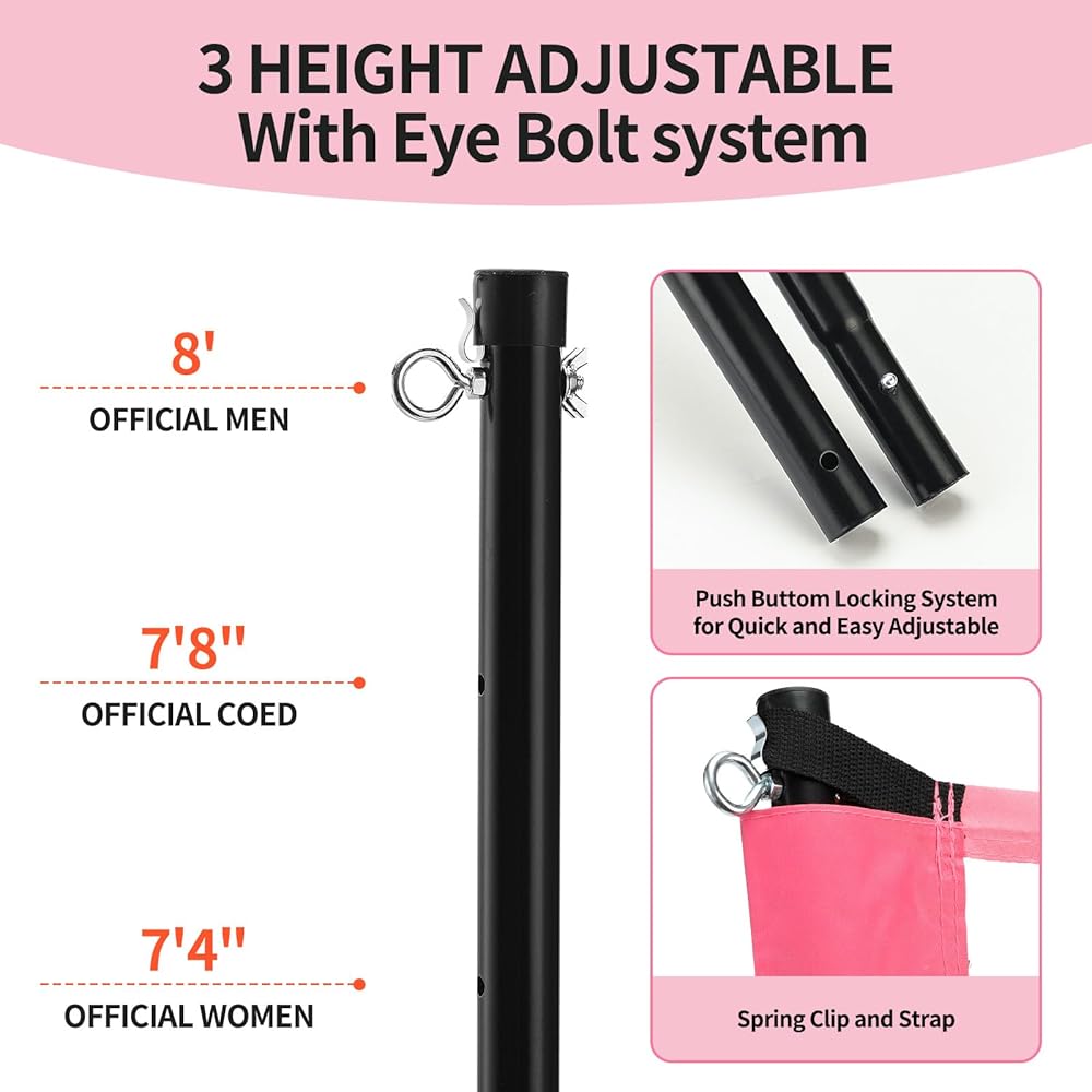 𝑵𝒐 𝑷𝒂𝒓𝒕𝒔 𝑨𝒅𝒅𝒆𝒅 + 𝑭𝒍𝒆𝒙𝒊𝒃𝒍𝒆 𝒕𝒐 𝑨𝒋𝒖𝒔𝒕 𝒕𝒉𝒆 𝑵𝒆𝒕: The poles boasts eye bolt to ensure 3 playing heights: men's(8''), co-ed (7'8'') and women's (7'4''). With about 500 times of test, guide ropes are perfectly matched with metal stakes, to adjust the reasonable position, firmly fixed despite of hard hit from volleyball.