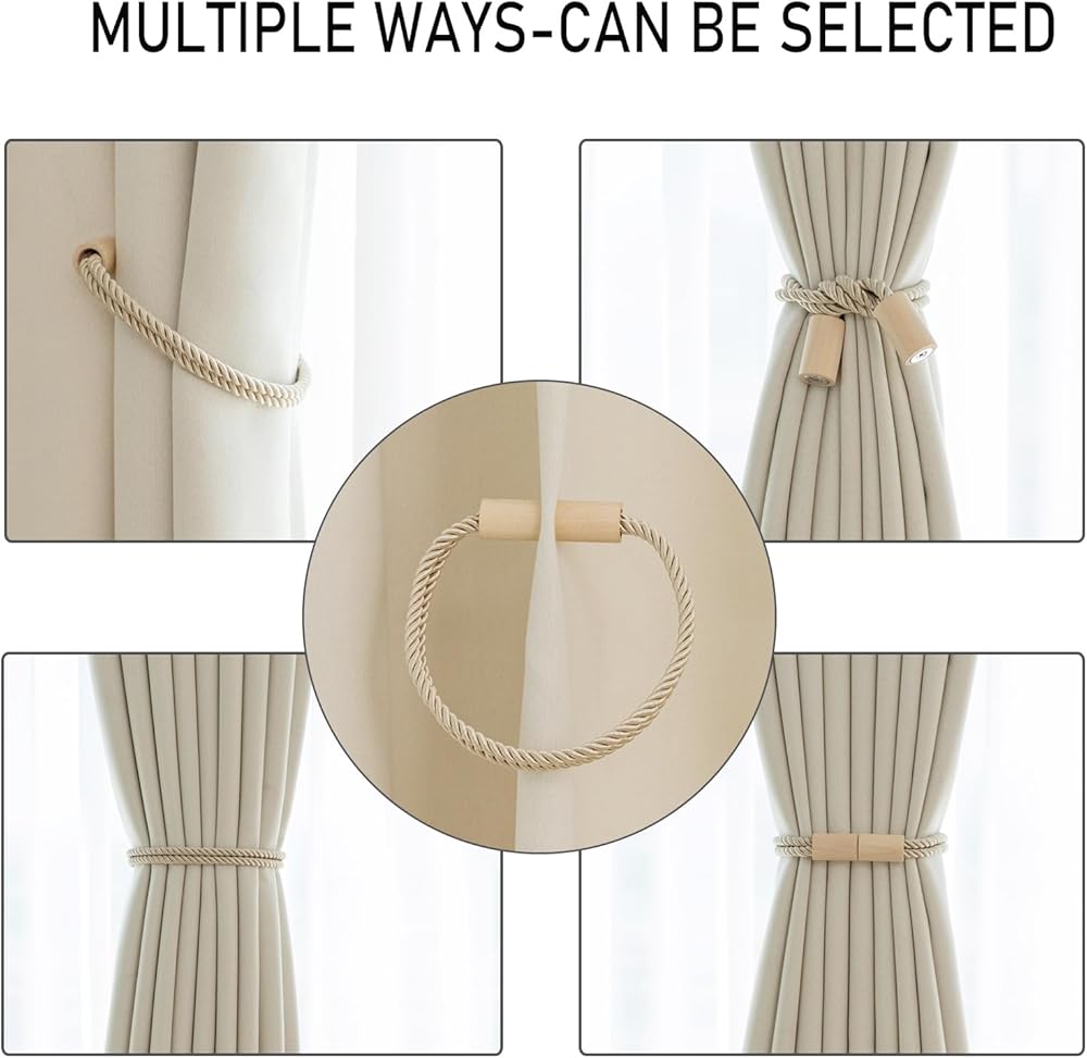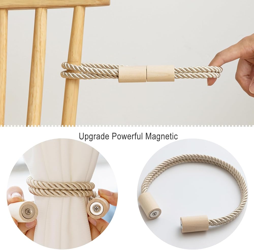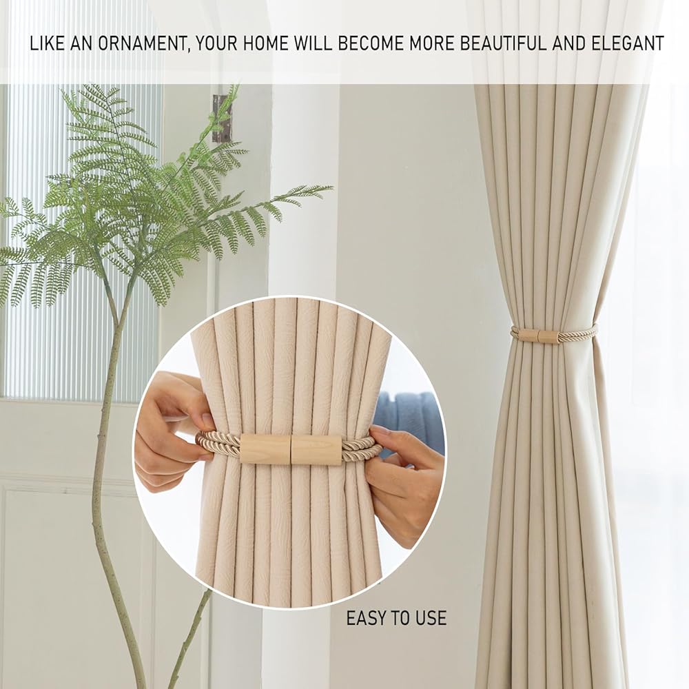 Curtain Tiebacks Magnetic Boho Curtain Holders for Drapes 2 Pack Rope Curtain Tie Backs for Curtains Wooden Window Treatment Holdbacks for Home Decorative Curtain, Beige
