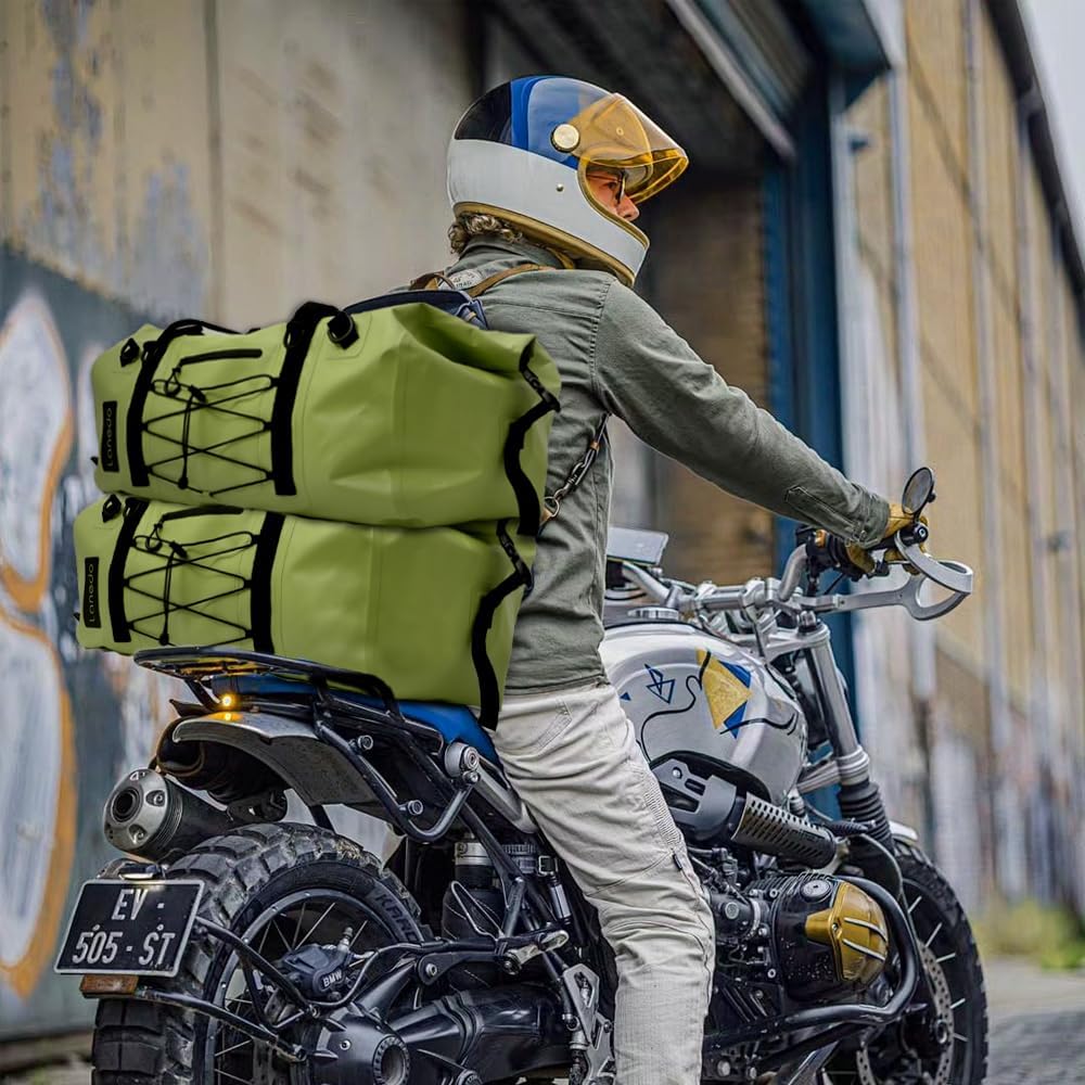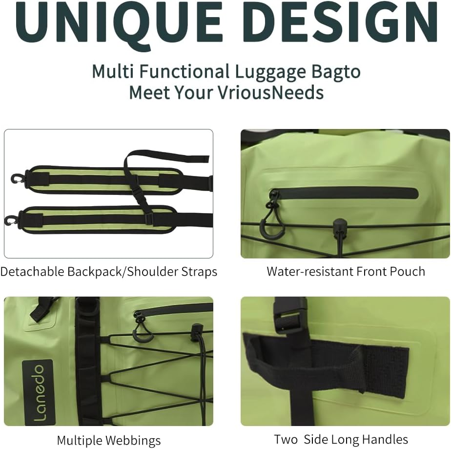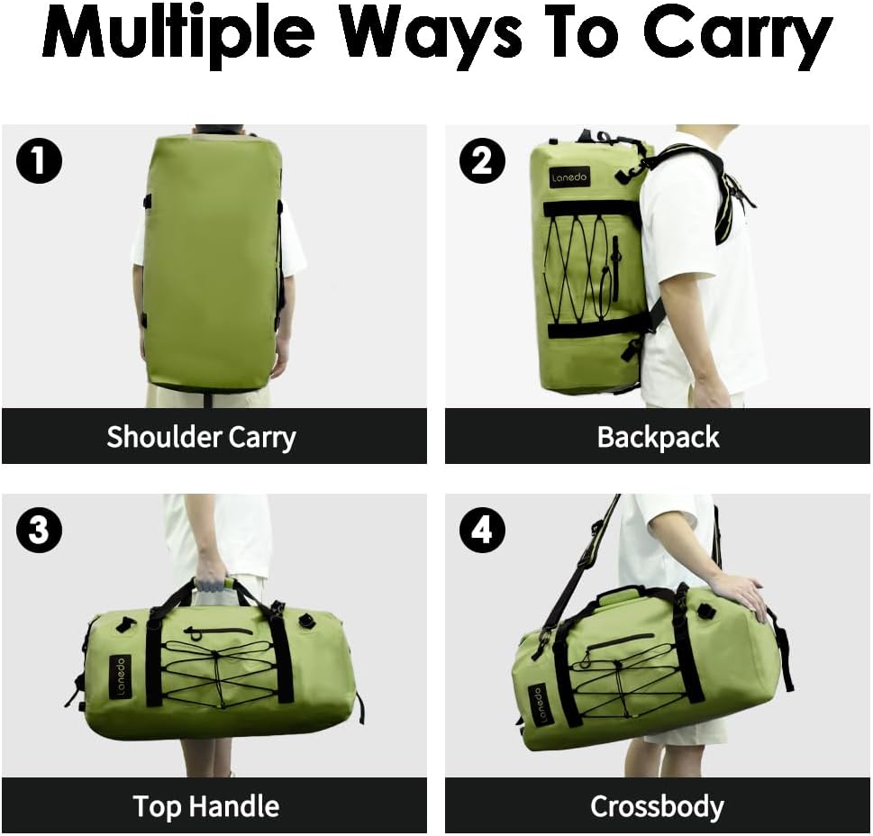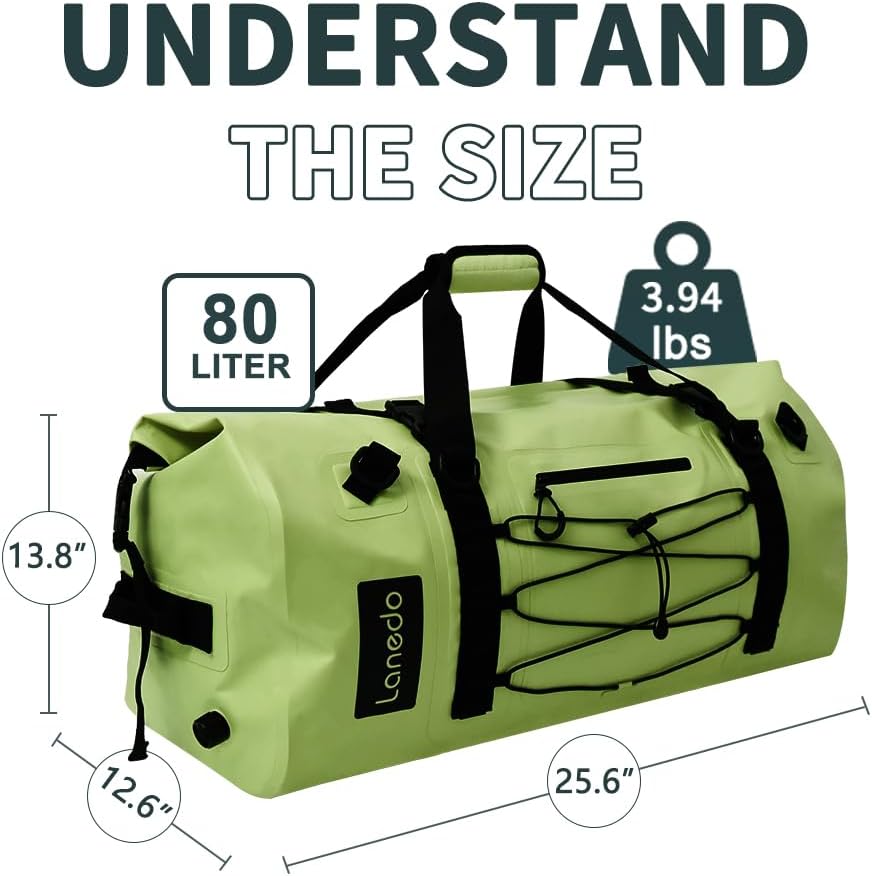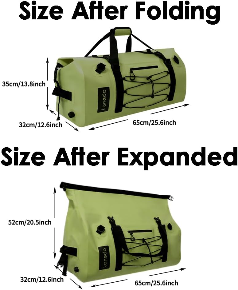 MILITARY LARGER DUFFLE BAG --LANEDO dry bag crafted from high-strength PVC for complete waterproof and snowproof protection, ensuring your belongings are completely dry. Its roll-top design with reliable Velcro closure allows for quick sealing by rolling the top and securing it with straps, even in harsh conditions