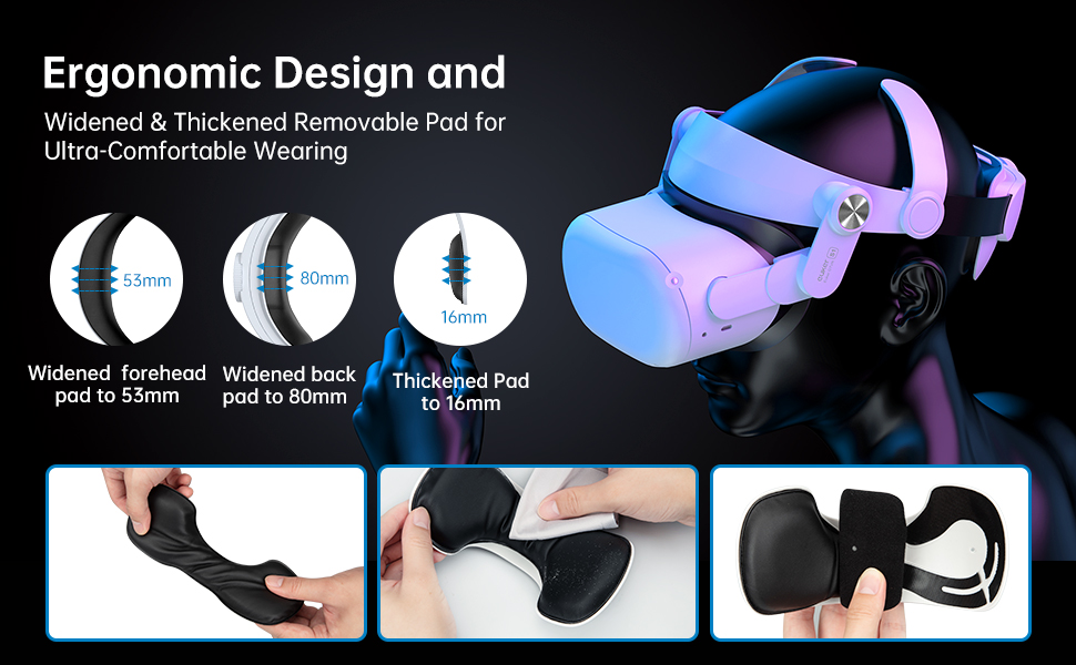 WIDENED&REINFORCED CUSHIONS: Compared with most other head straps, Euker Q2 headset strap pad is widened and thickened.The forehead and back pad is widened to 53mm and 80mm respectively, a nd all pad is thickened to 16mm,more comfortable to wear to greatly extending the time of playing the game.