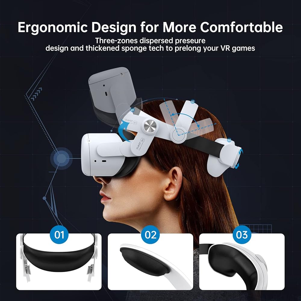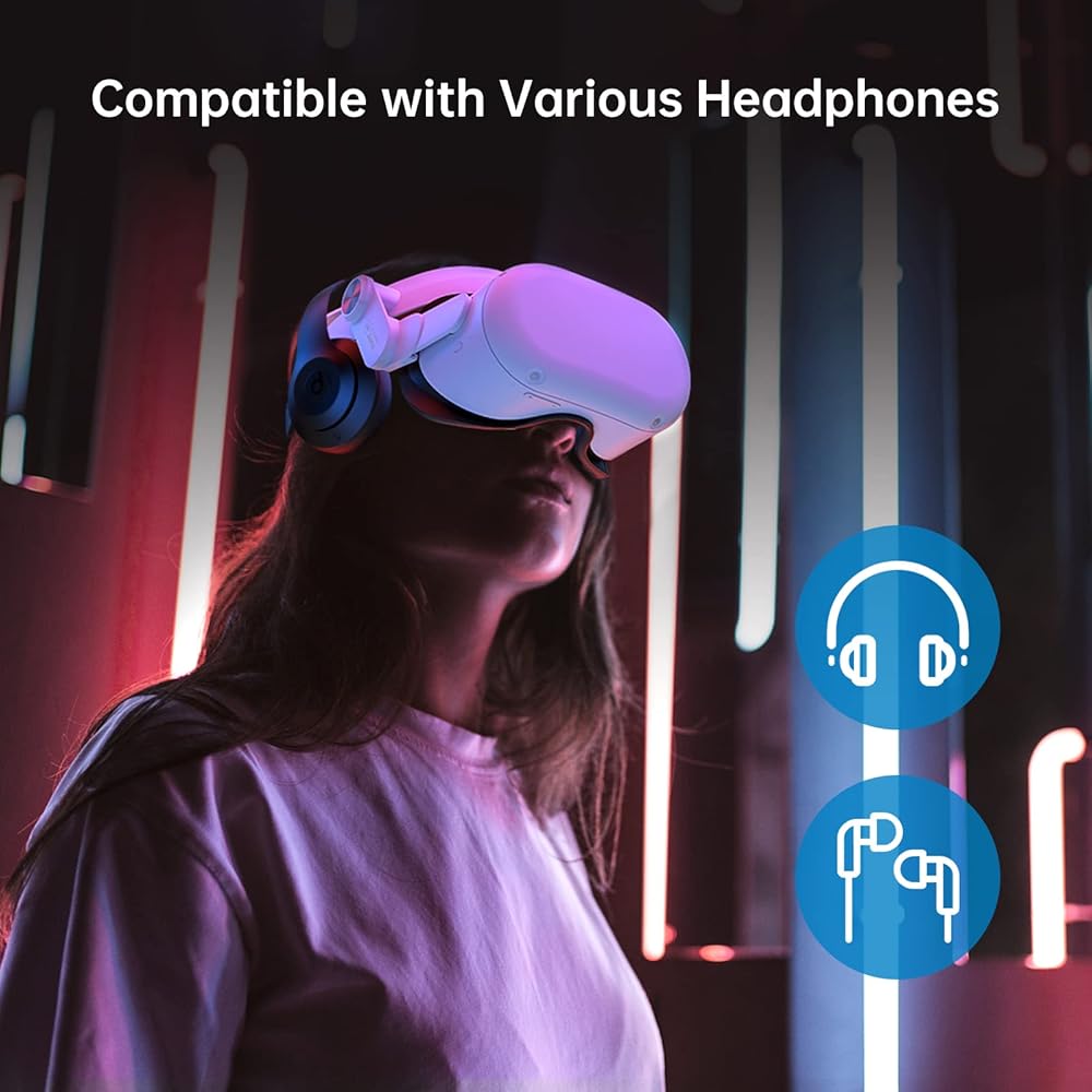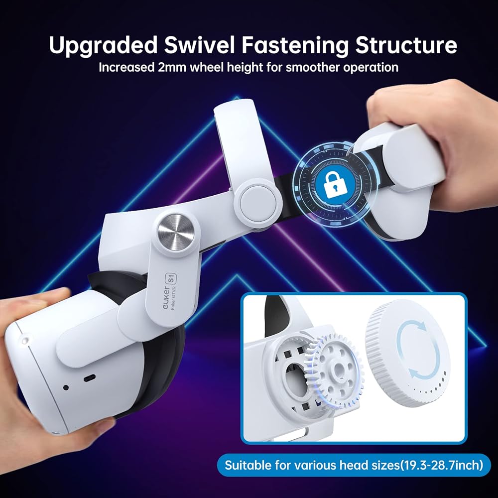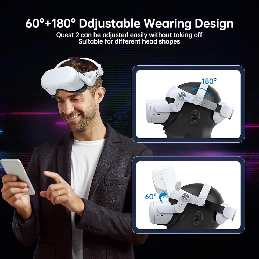QUICKER ADJUSTMENT: The 180° quick adjustment at the top can make your VR wear more stable. And 60° adjustment on the ear side can make the Q2 be adjusted easily without taking off, making the phone talk easier. Increased 2mm adjustable knob for smoother operation to suit for various head sizes(19.3-28.7inch),great for both kids and adults