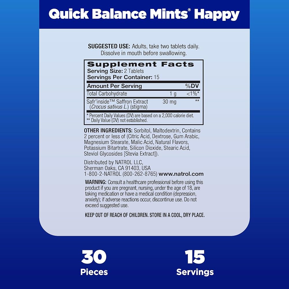Occasional Stress Support: One (1) 30 count tin of Natrol Quick Balance Happy Mints Supplement in Orange Mango Saffron flavor for a 15-day supply