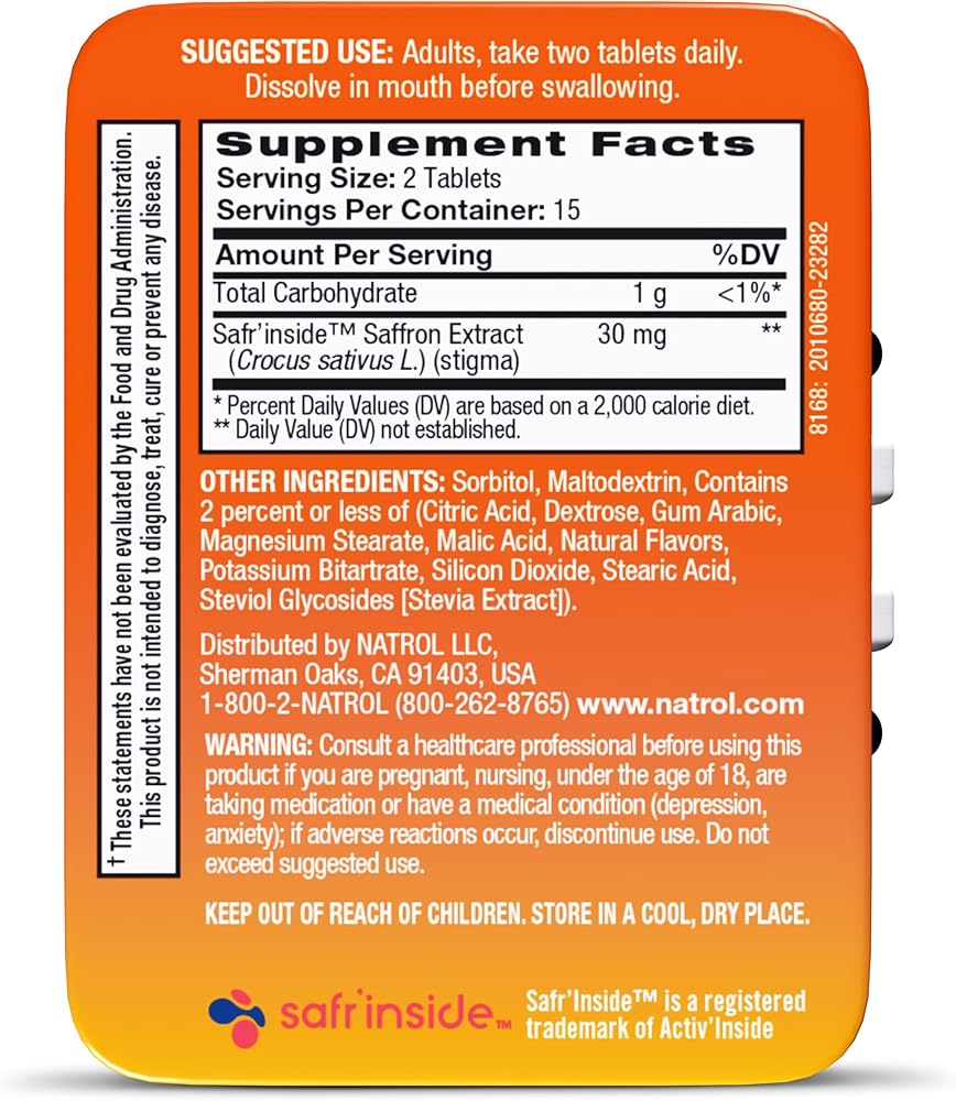Natrol Quick Balance Mints are easy and convenient for life on the go. These Natrol dietary supplements are clinically shown to support a healthy stress response and relieve occasional stress.(1) This Quick Balance Mint starts working in 30 minutes to relieve occasional stress, and after four weeks of daily use, to help support a positive outlook and improved irritability.(1) The non-GMO, sugar-free Quick Balance Mints have a delicious Orange Mango Saffron flavor. Packaged in a convenient on-the-go tin and ready to go with you anywhere. Adults, take two tablets daily, dissolving in the mouth before swallowing. Natrol is dedicated to creating innovative, quality products, to help you maintain good health and thrive in your busy, modern lifestyle.(1) (1) These statements have not been evaluated by the Food and Drug Administration; this product is not intended to diagnose, treat, cure or prevent any disease.