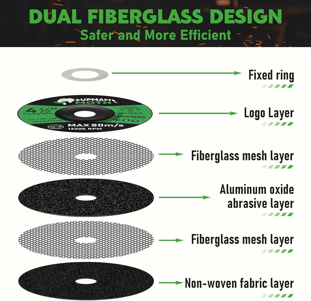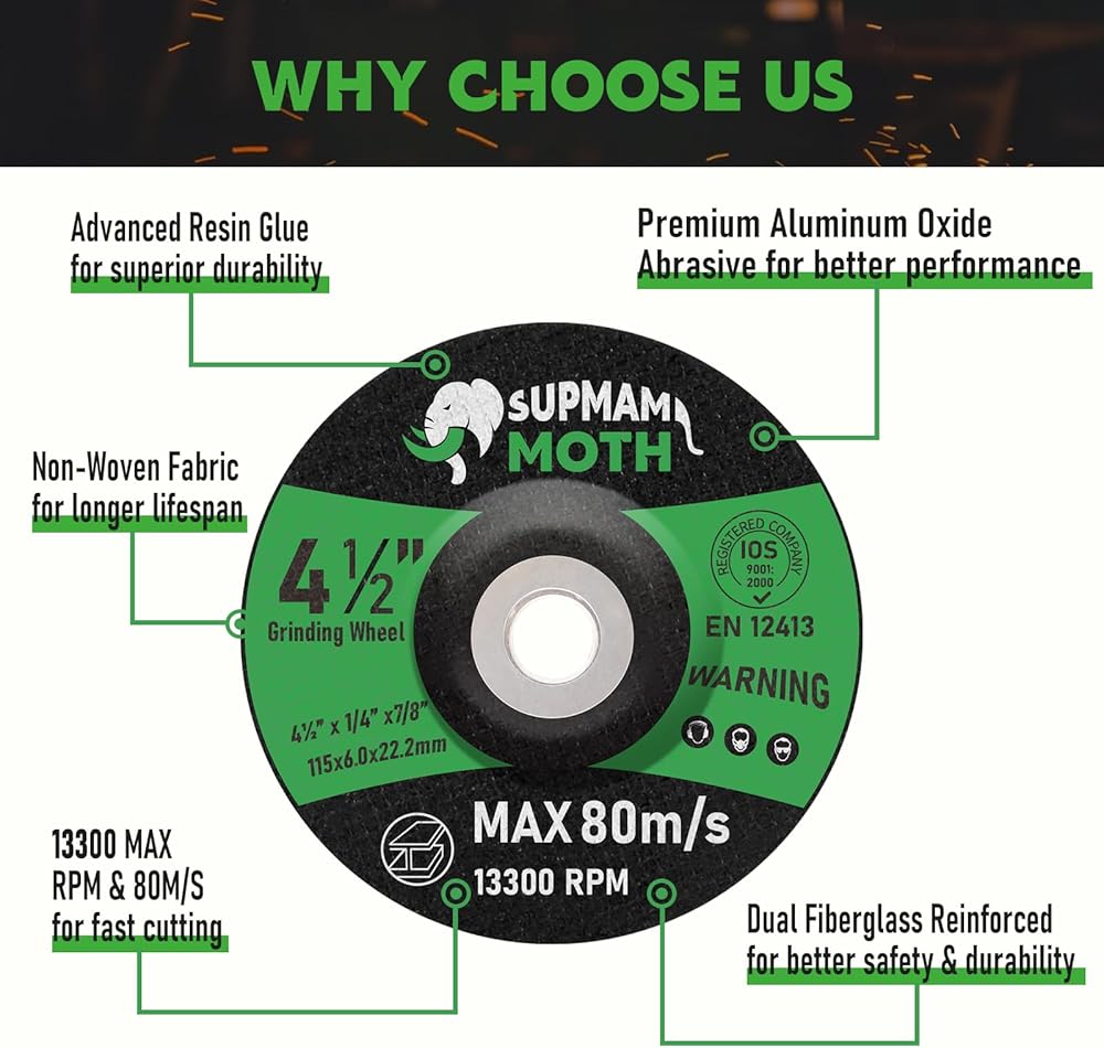 【Durability & Safety】Our grinding wheels 4 1/2 inch are made from high-quality aluminum oxide grains-corundum and white alundum, reinforced with double-layer fiberglass mesh. They offer stronger, longer-lasting, faster, and safer cutting, with twice the lifespan of regular wheels. Comply with EU EN 12413 standards.